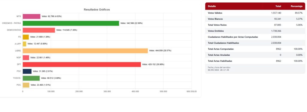 Santa Cruz, 6 de abril de 2026 (ABI).- Tras la repetición de la votación en 105 mesas de sufragio, el Tribunal Electoral Departamental (TED) de Santa Cruz cerró este lunes el cómputo oficial y ratificó la segunda vuelta electoral por la Gobernación cruceña.