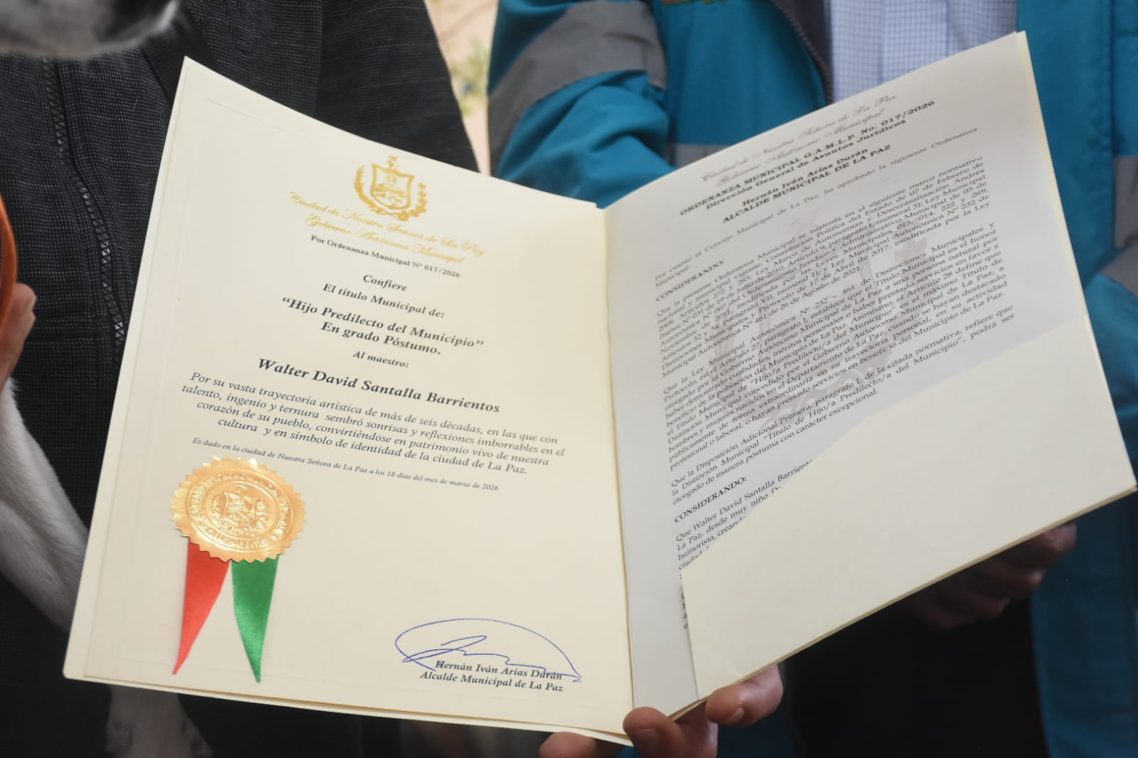 La Paz, 15 de abril de 2026 (ABI).– El alcalde del Gobierno Autónomo Municipal de La Paz, Iván Arias, entregó el título municipal de “Hijo Predilecto” en grado póstumo al hijo del maestro David Santalla Barrientos, Yúngaro Santalla.