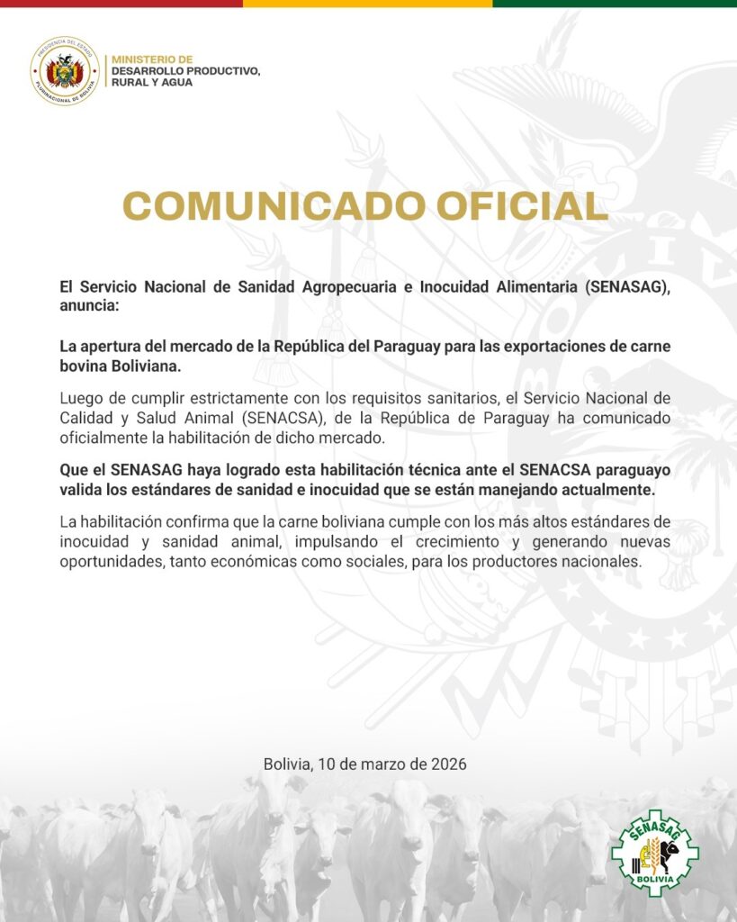 «Luego de cumplir estrictamente con los requisitos sanitarios, el Servicio Nacional de Calidad y Salud Animal (Senacsa), de la República de Paraguay, ha comunicado oficialmente la habilitación de dicho mercado. Que el Senasag haya logrado esta habilitación técnica ante el Senacsa paraguayo valida los estándares de sanidad e inocuidad que se están manejando actualmente», señala un comunicado de la estatal boliviana.