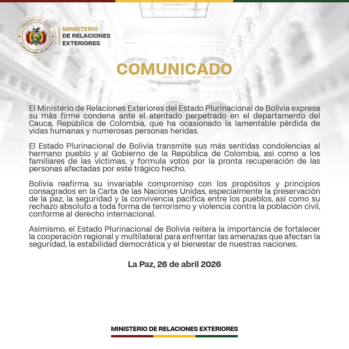 La Paz, 26 de abril de 2026 (ABI). – A través de la Cancillería, Bolivia expresó este domingo sus condolencias al pueblo de Colombia por el atentado que dejó pérdidas de vidas humanas en el departamento de Cauca y manifestó su rechazo a toda forma de terrorismo y violencia.