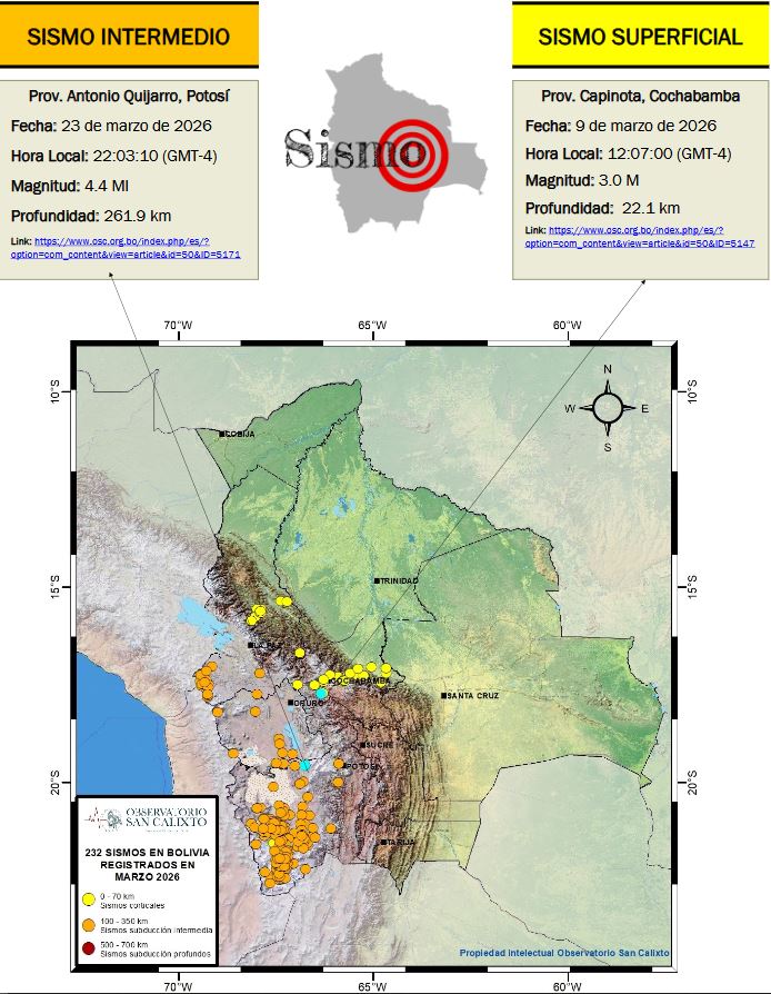 Entre los eventos más significativos, se reportó un sismo de magnitud 4,4 el 23 de marzo a las 22:03, localizado a 43 kilómetros al sur-suroeste de Quillacas, provincia Antonio Quijarro, Potosí, a 261,9 km de profundidad. Otro sismo notable ocurrió el 9 de marzo en la provincia Capinota, Cochabamba, con magnitud 3,0 y 22,1 km de profundidad.