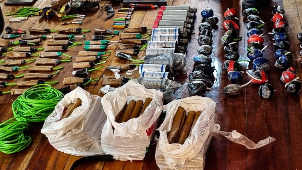 En el segundo campamento se encontraron 11 teléfonos celulares y un revólver, mientras que en el tercero se incautaron ocho teléfonos celulares, 50 dinamitas engarzadas listas para usar, 45 cartuchos adicionales, 17 granadas de gas, dos rollos de mecha de seguridad, tres bolsas de dinamita y un subfusil con cargador, entre otros.