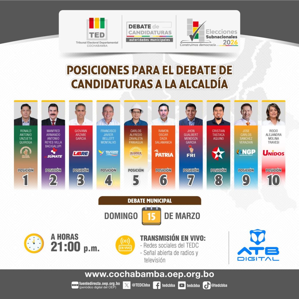El Tribunal Electoral Departamental (TED) de Cochabamba definió el siguiente orden de participación: Ronald Unzueta (MTS), Manfred Reyes Villa (Súmate), Giovanni Arzabe (Libre), Francisco Bellot (Soluciones con Todos), Carlos Zavaleta (Alianza Unidos por los Pueblos), Ramón Daza (Patria), Jhon Mendoza (FRI), Cristian Tastaca (PDC), José Carlos Sánchez (NGP) y Rocío Molina (Unidos).