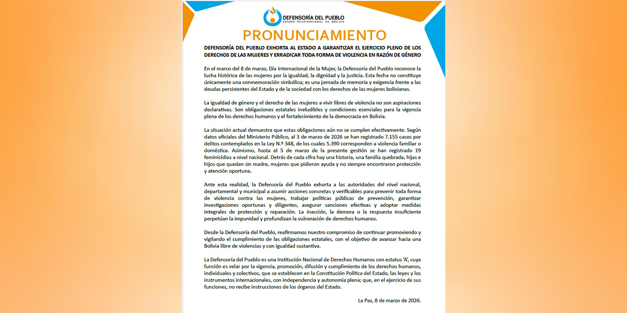 La Paz, 8 de marzo de 2026 (ABI). – La Defensoría del Pueblo exhortó este domingo al Estado a garantizar el ejercicio pleno de los derechos de las mujeres y a erradicar la violencia de género, en el contexto del Día Internacional de la Mujer.