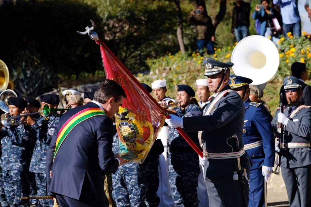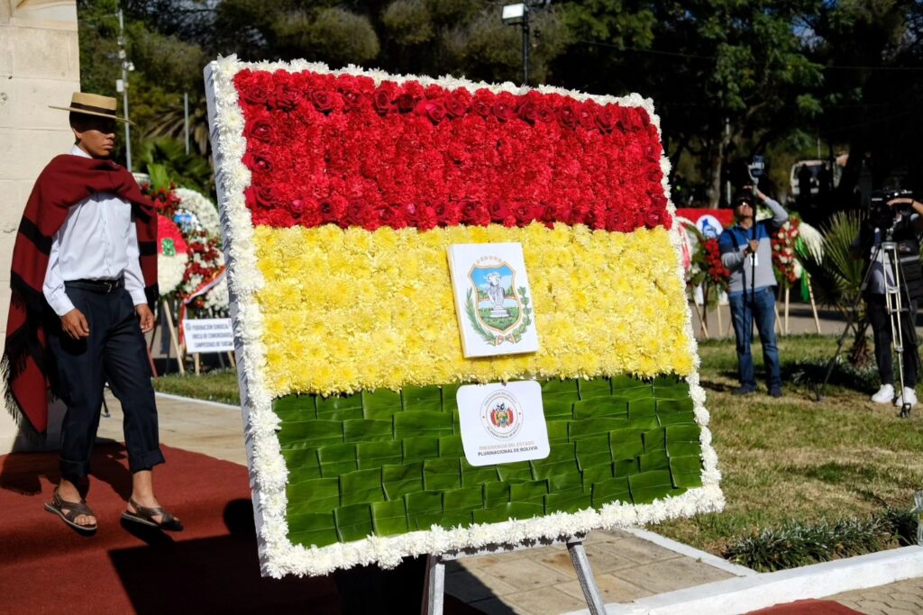 El jefe de Estado izó la bandera boliviana y con todos los presentes entonaron el himno nacional de Bolivia en el parque Mirador Héroes de la Independencia.