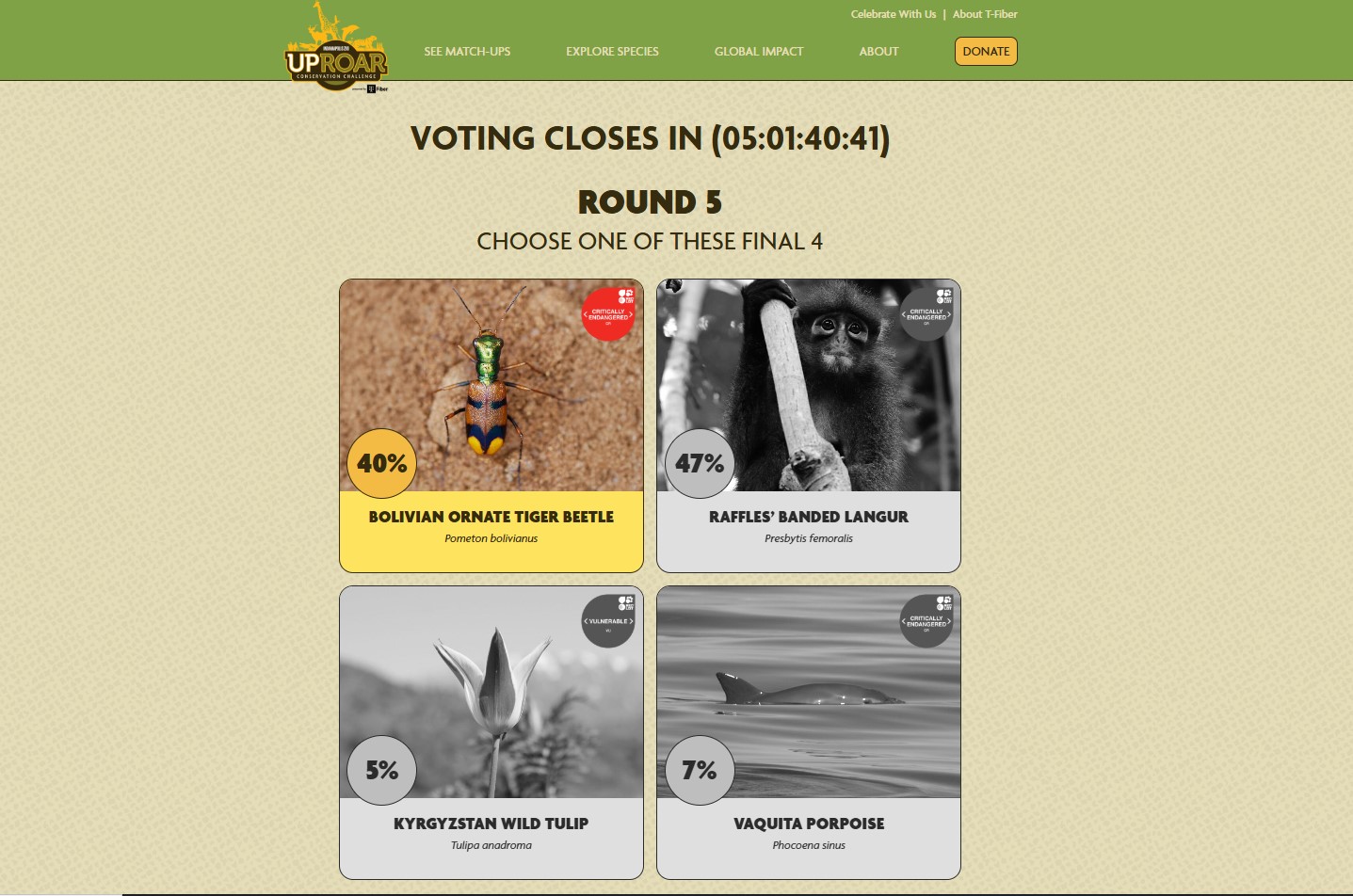 El concurso reúne especies en riesgo de extinción en un formato de eliminación directa que inició con 64 participantes, entre animales, plantas y hongos. Tras varias rondas, solo cuatro especies permanecen en competencia y el voto del público define al ganador.