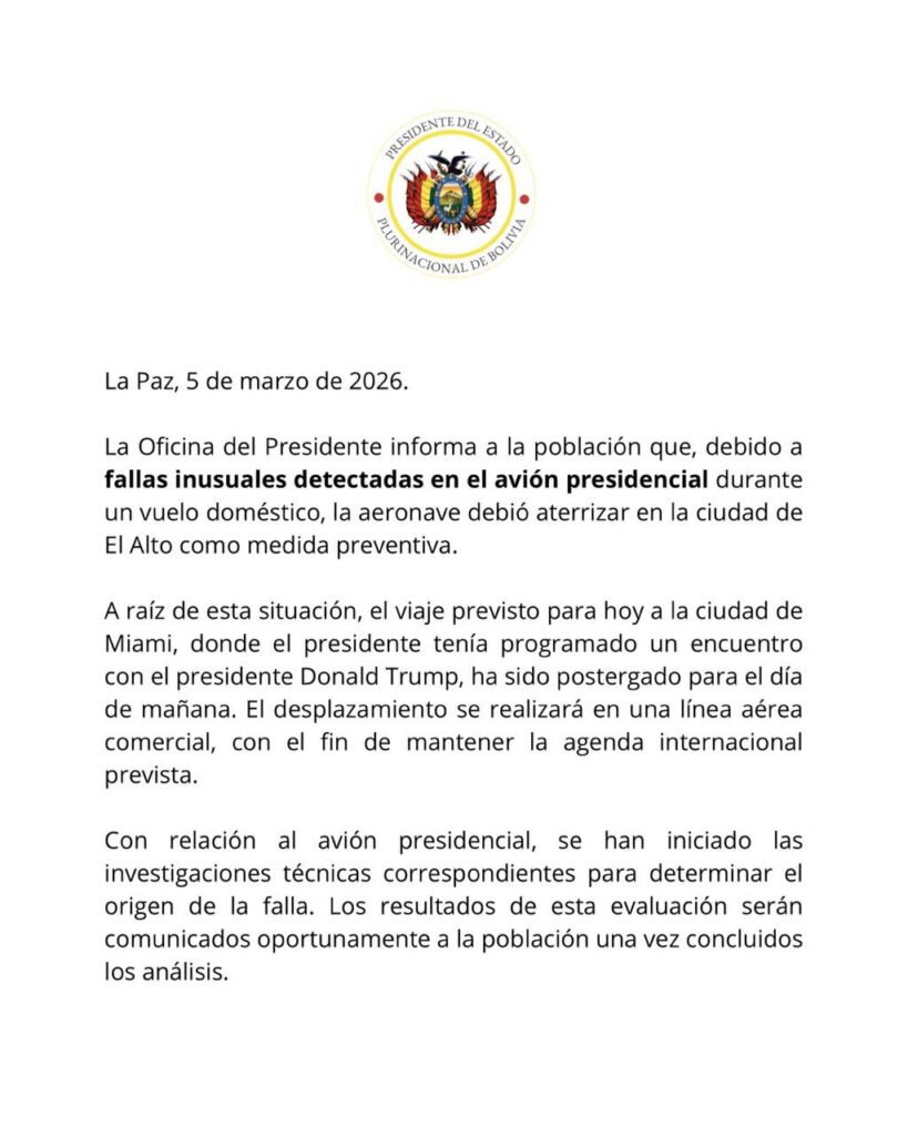 La Paz, 5 de marzo (ABI).-La Oficina del Presidente Rodrigo Paz, a través de un comunicado, informó este jueves que el avión presidencial realizó un aterrizaje preventivo en la ciudad de El Alto tras detectarse fallas inusuales durante un vuelo doméstico, debido a esta situación, el viaje que el presidente tenía programado para este jueves a la ciudad de Miami, en Estados Unidos, fue reprogramado para mañana viernes.