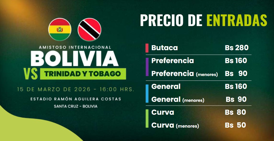 Santa Cruz, 10 de marzo de 2026 (ABI).- La Federación Boliviana de Fútbol (FBF) informó que este miércoles 11, a partir de las 16:00, se habilitará la venta en línea de entradas para el partido amistoso entre Bolivia y Trinidad y Tobago, que se jugará el domingo en el estadio Tahuichi Aguilera a las 16:00.