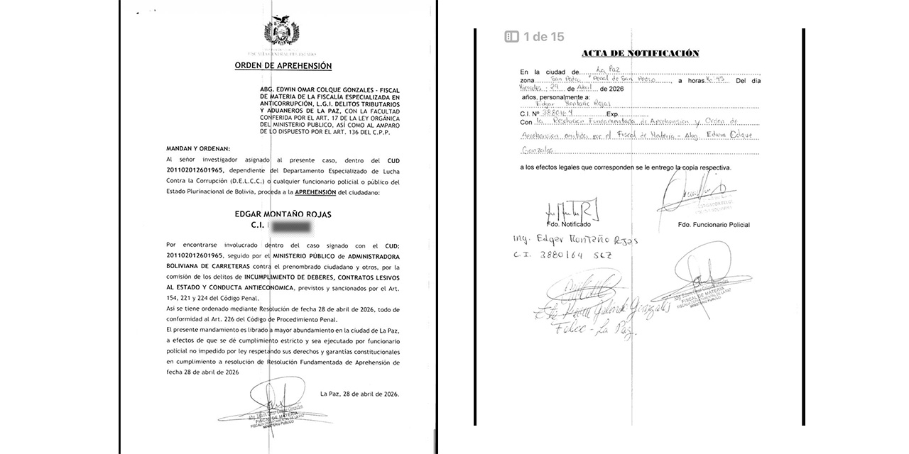 De acuerdo con el mandamiento fiscal, la medida fue dispuesta por el fiscal de materia Edwin Omar Colque Gonzales, en el marco de una investigación iniciada a denuncia de la Administradora Boliviana de Carreteras (ABC), por los delitos de incumplimiento de deberes, contratos lesivos al Estado y conducta antieconómica.