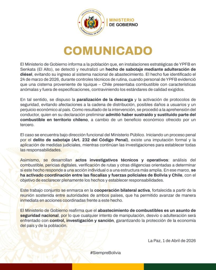 La Paz, 1 de abril de 2026 (ABI).- El Ministerio de Gobierno informó este miércoles que fue detectado y neutralizado un hecho de sabotaje en instalaciones estratégicas de YPFB en Senkata, en la ciudad de El Alto, tras identificarse la adulteración de un cargamento de diésel que pretendía ingresar al sistema nacional de abastecimiento.