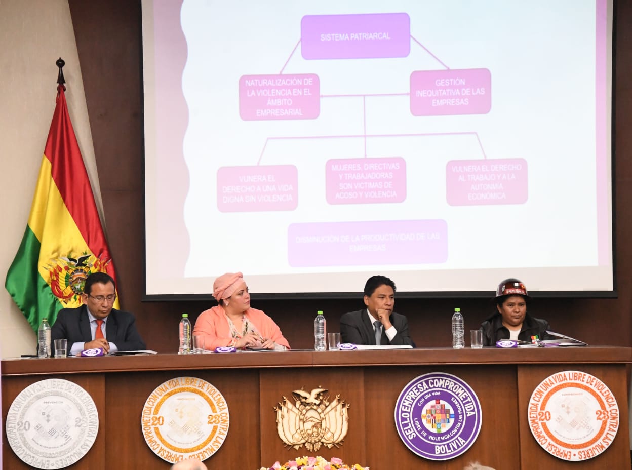 Lanzamiento del Sello Empresa Comprometida con una Vida Libre de Violencia Contra las Mujeres en el Estado Plurinacional de Bolivia, con la presencia de la ministra de la Presidencia Maria Nela Prada y el ministro de Justicia y Transparencia Instituciona