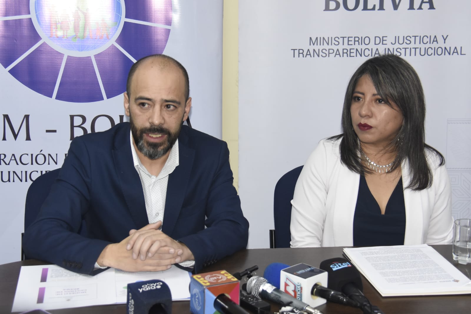 La viceministra de Igualdad de Oportunidades, Nadia Cruz Tarifa, junto a representantes de la Federación de Asociaciones Municipales de Bolivia (FAM) y de la Asociación de Concejalas de Bolivia (ACOBOL) en conferencia de prensa informaron respecto al ingreso a 125 municipios, que se llevará adelante entre abril y junio de este año, con el objetivo de identificar el estado de situación de los servicios municipales de protección a víctimas de violencia. Fotos: G. JALLASI