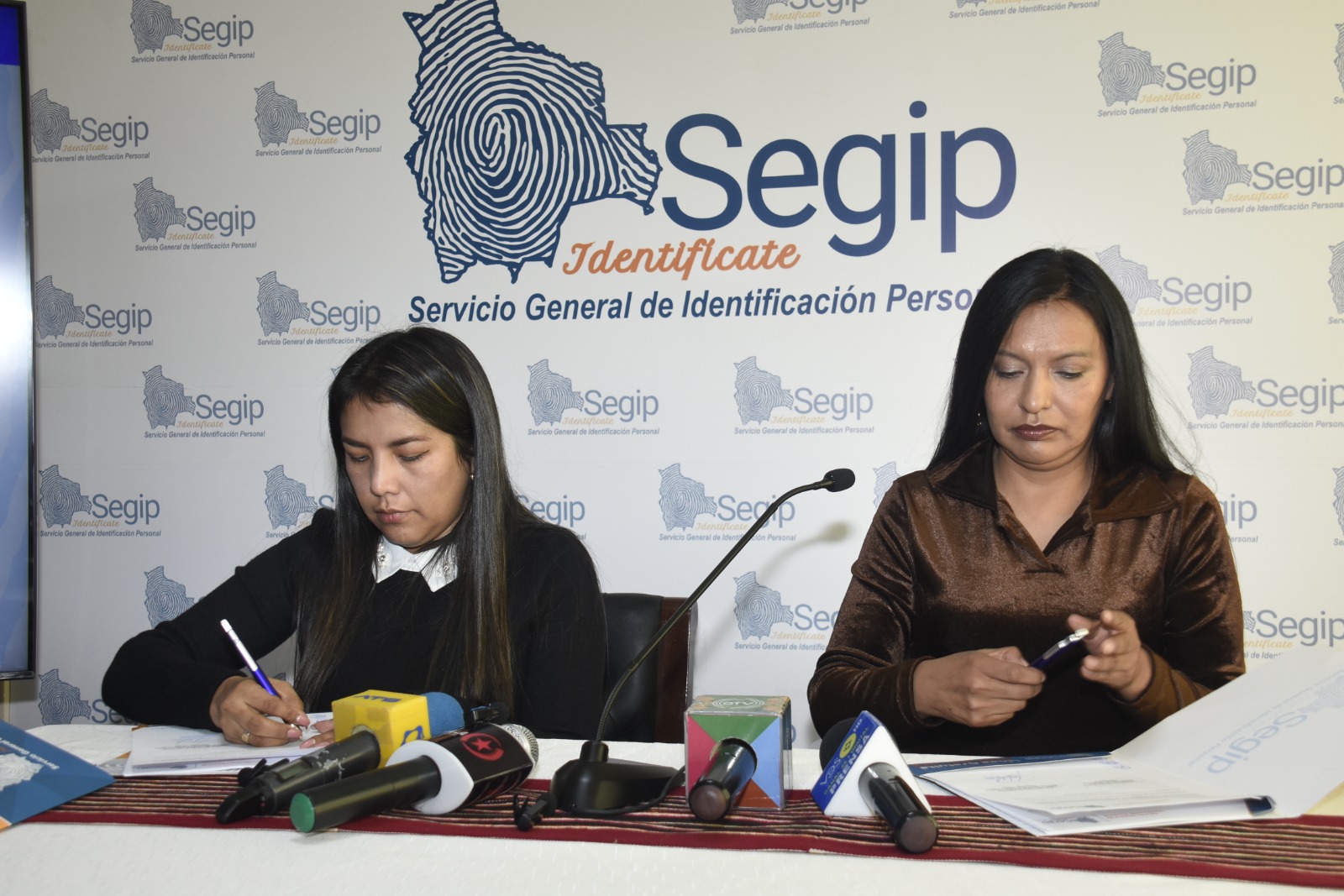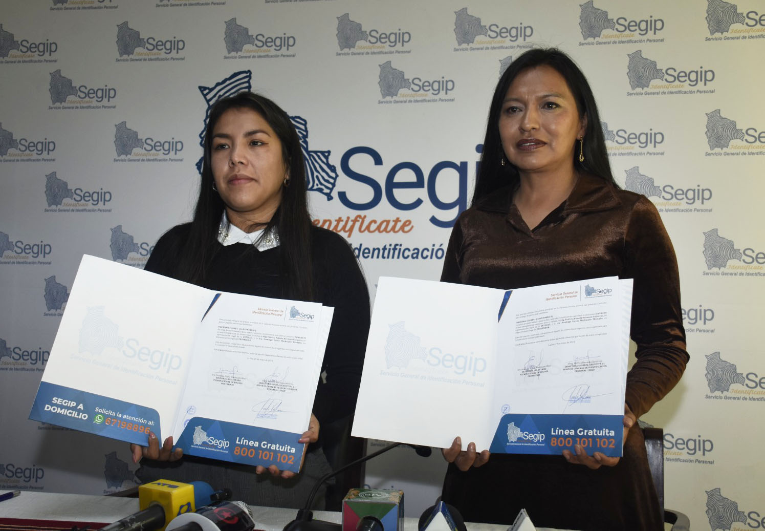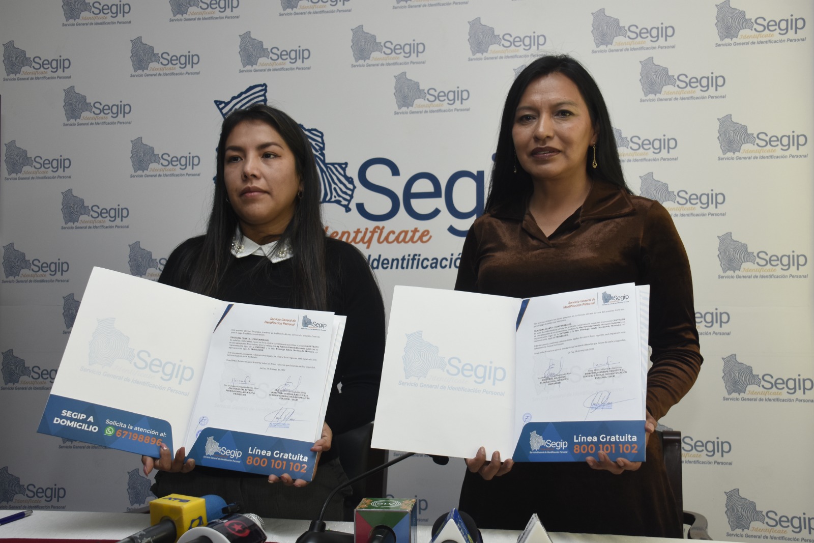 Patricia Hermosa directora general del Servicio General de Identificación Personal (Segip), y Estela Machicado Gerente de la Editorial del Estado Plurinacional, suscriben un convenio