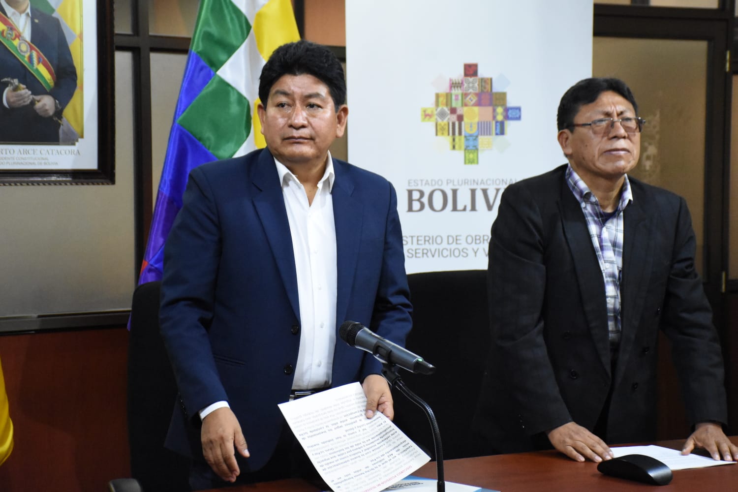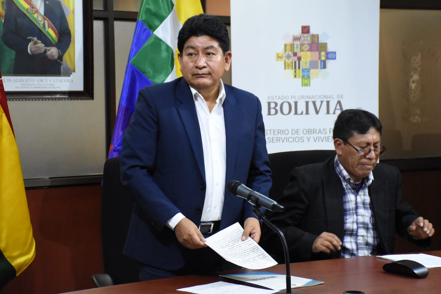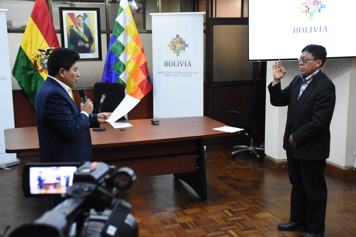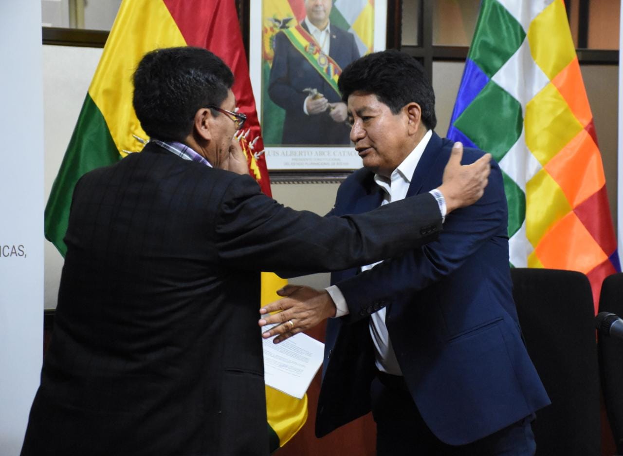 El ministro de Obras Públicas, Servicios y Vivienda, Edgar Montaño, posesiona al nuevo Gerente Ejecutivo de la Empresa Estatal por Cable "Mi Teleférico" Martín Quino Huasco. Fotos: Jorge Mamani y Freddy Barragán