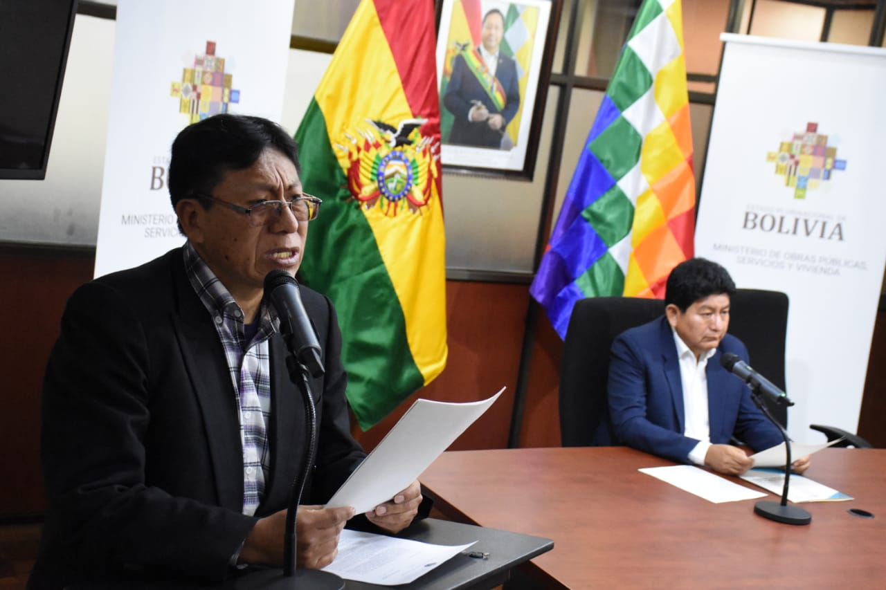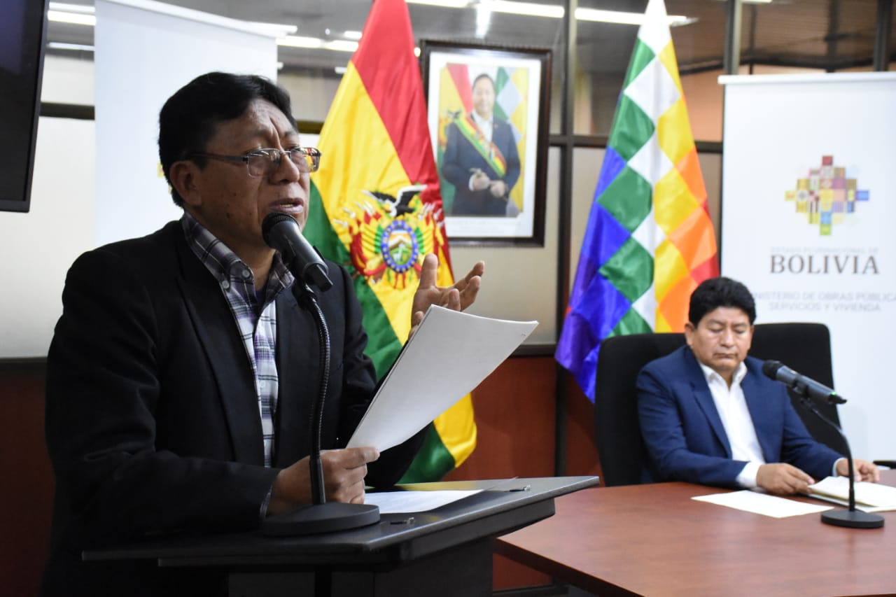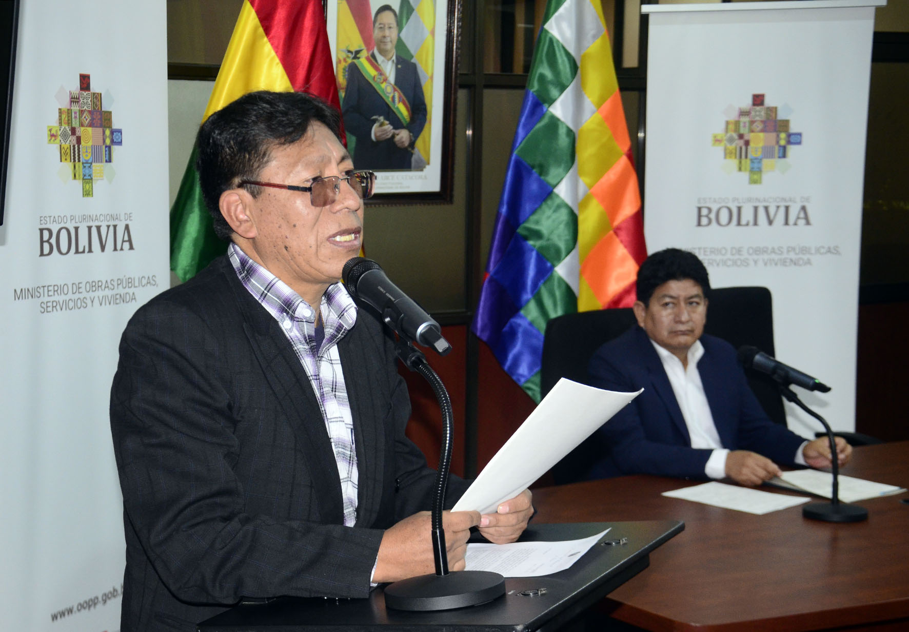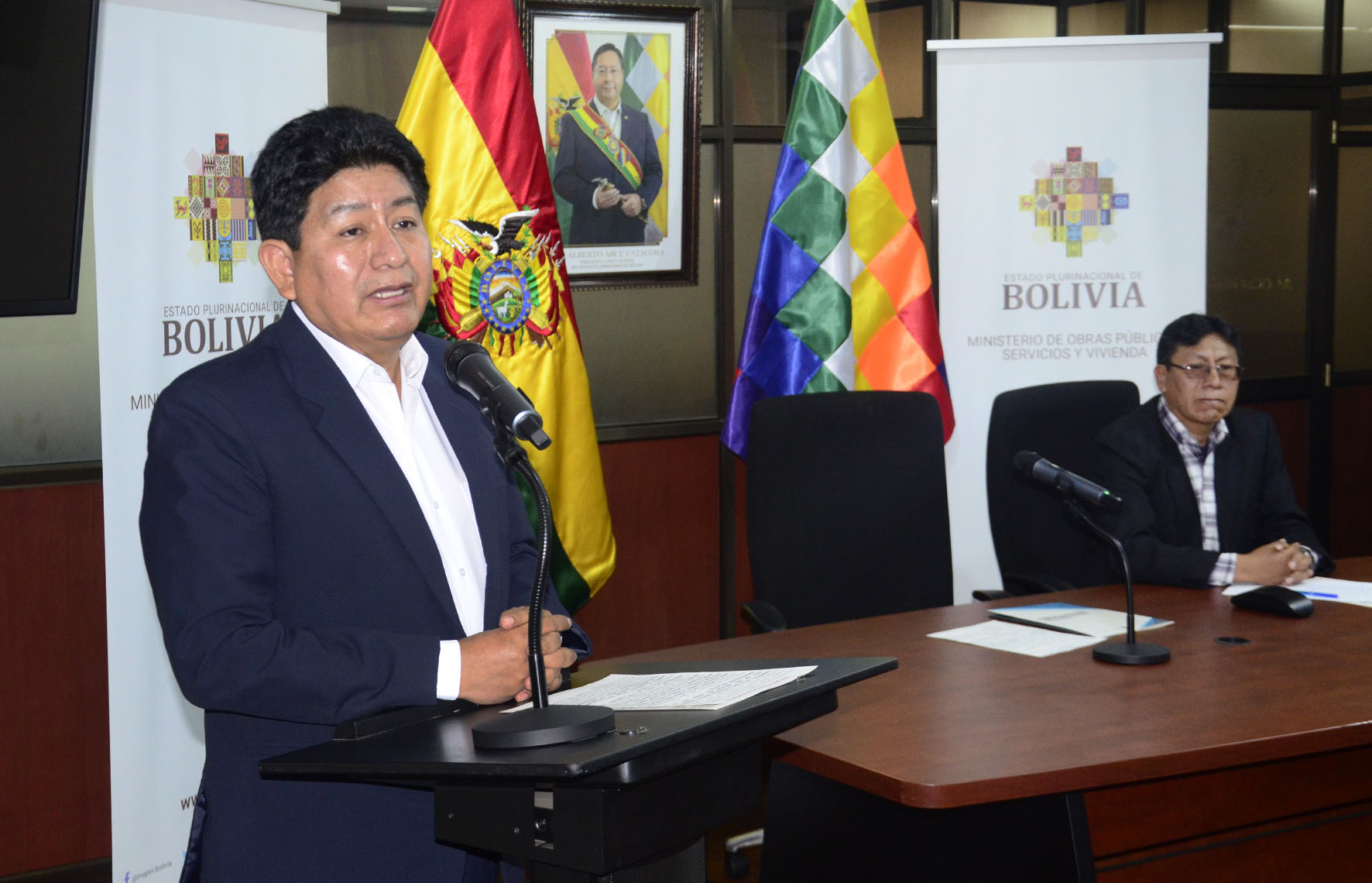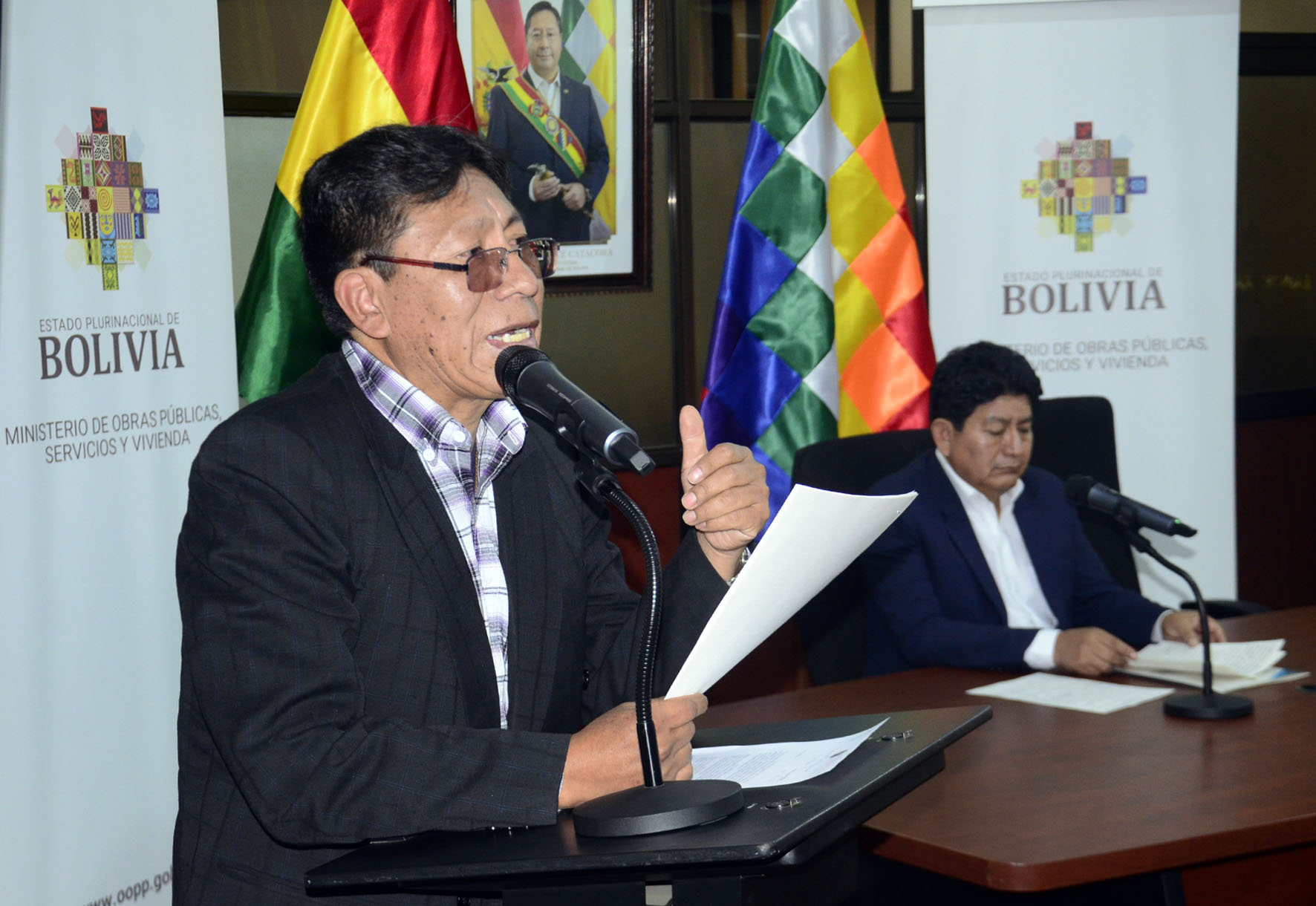 El ministro de Obras Públicas, Servicios y Vivienda, Edgar Montaño, posesiona al nuevo Gerente Ejecutivo de la Empresa Estatal por Cable "Mi Teleférico" Martín Quino Huasco. Fotos: Jorge Mamani y Freddy Barragán