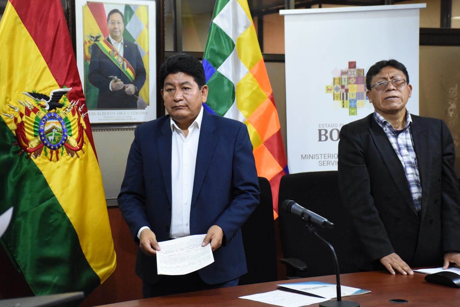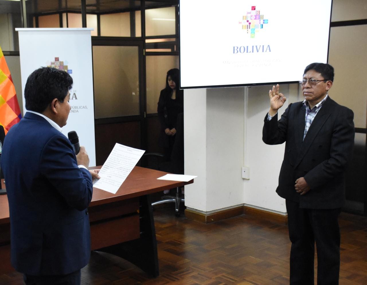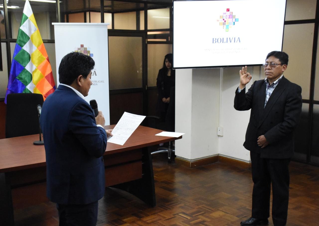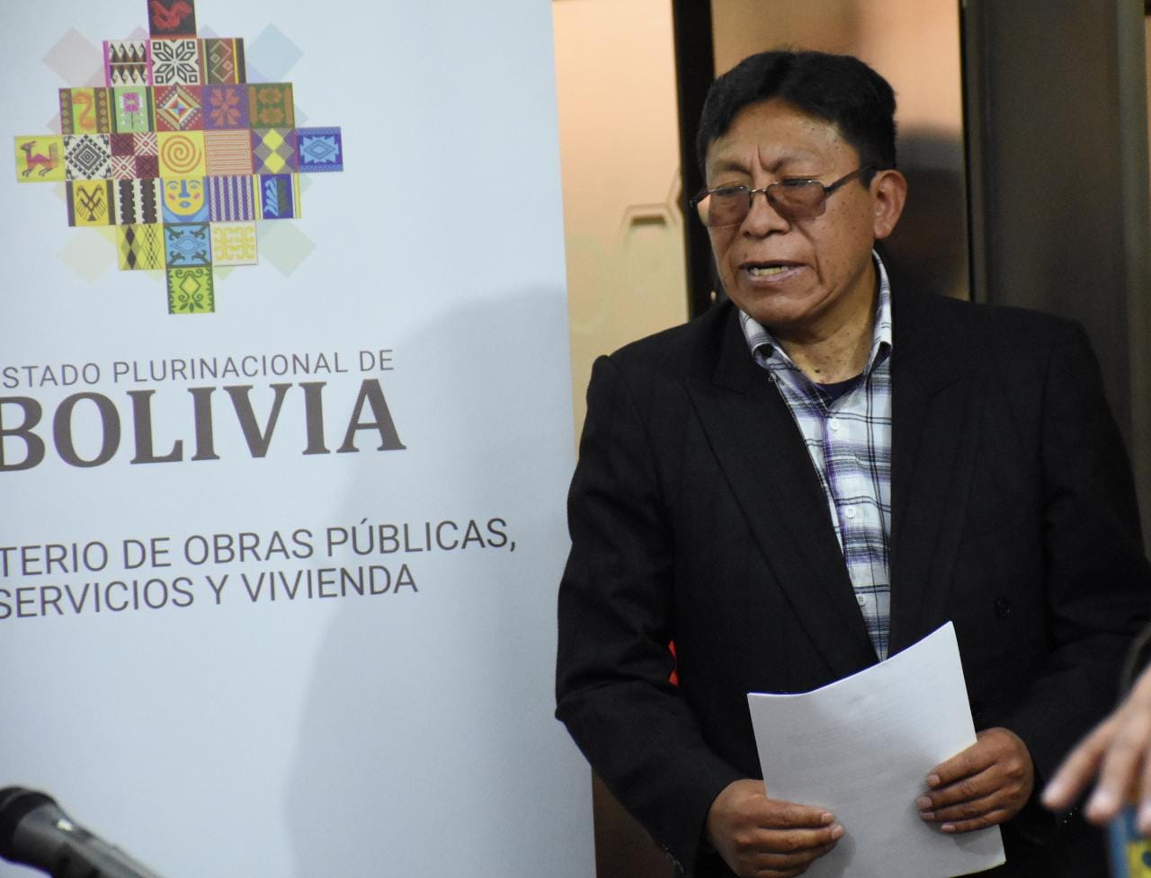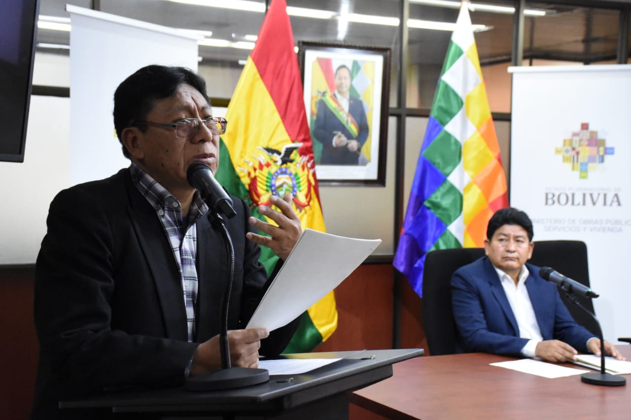 El ministro de Obras Públicas, Servicios y Vivienda, Edgar Montaño, posesiona al nuevo Gerente Ejecutivo de la Empresa Estatal por Cable "Mi Teleférico" Martín Quino Huasco. Fotos: Jorge Mamani y Freddy Barragán