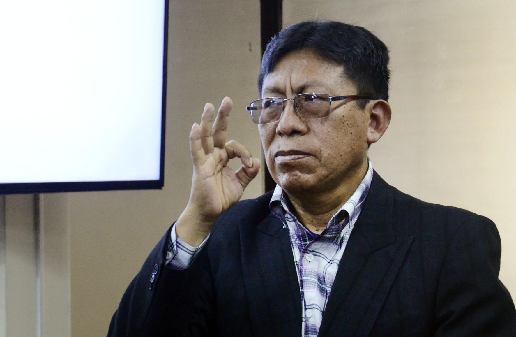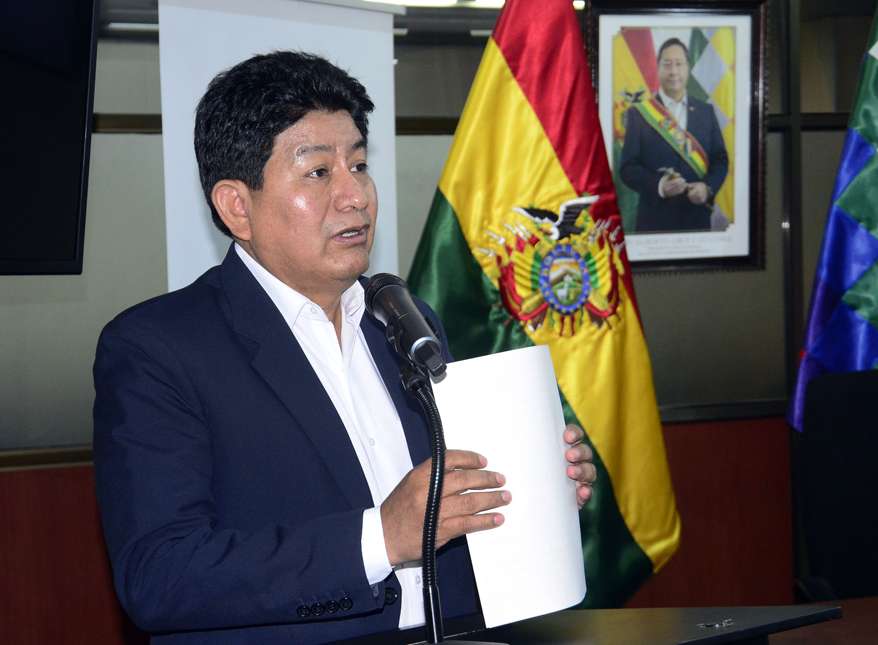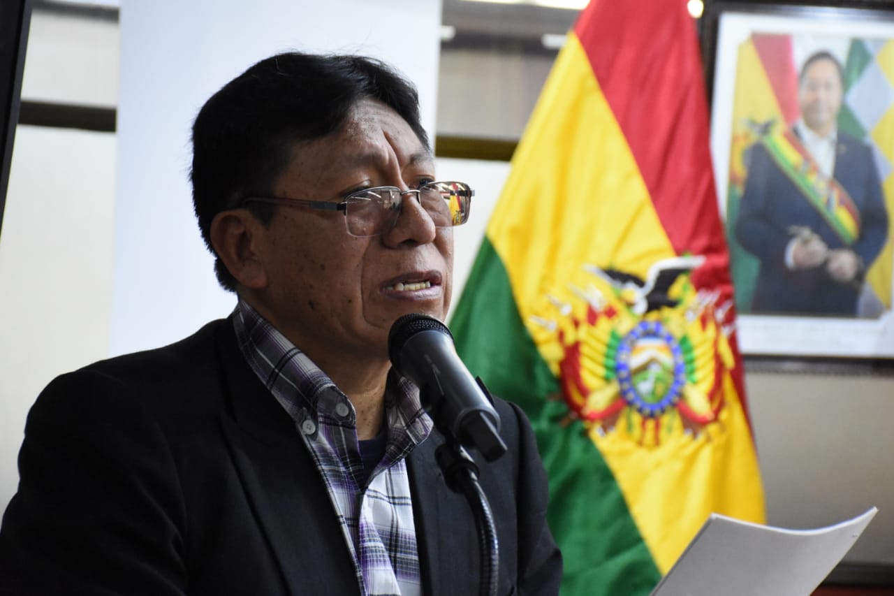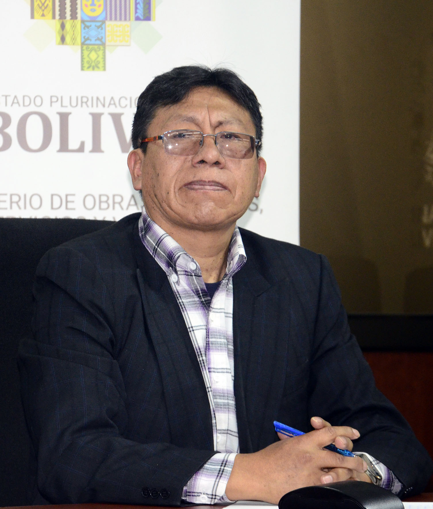 El ministro de Obras Públicas, Servicios y Vivienda, Edgar Montaño, posesiona al nuevo Gerente Ejecutivo de la Empresa Estatal por Cable "Mi Teleférico" Martín Quino Huasco. Fotos: Jorge Mamani y Freddy Barragán
