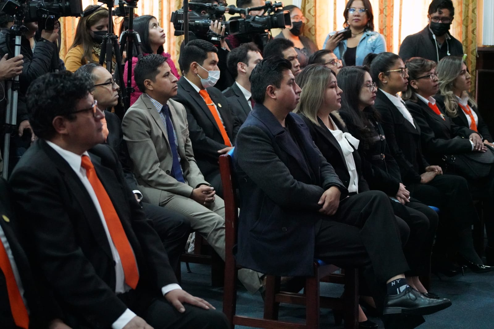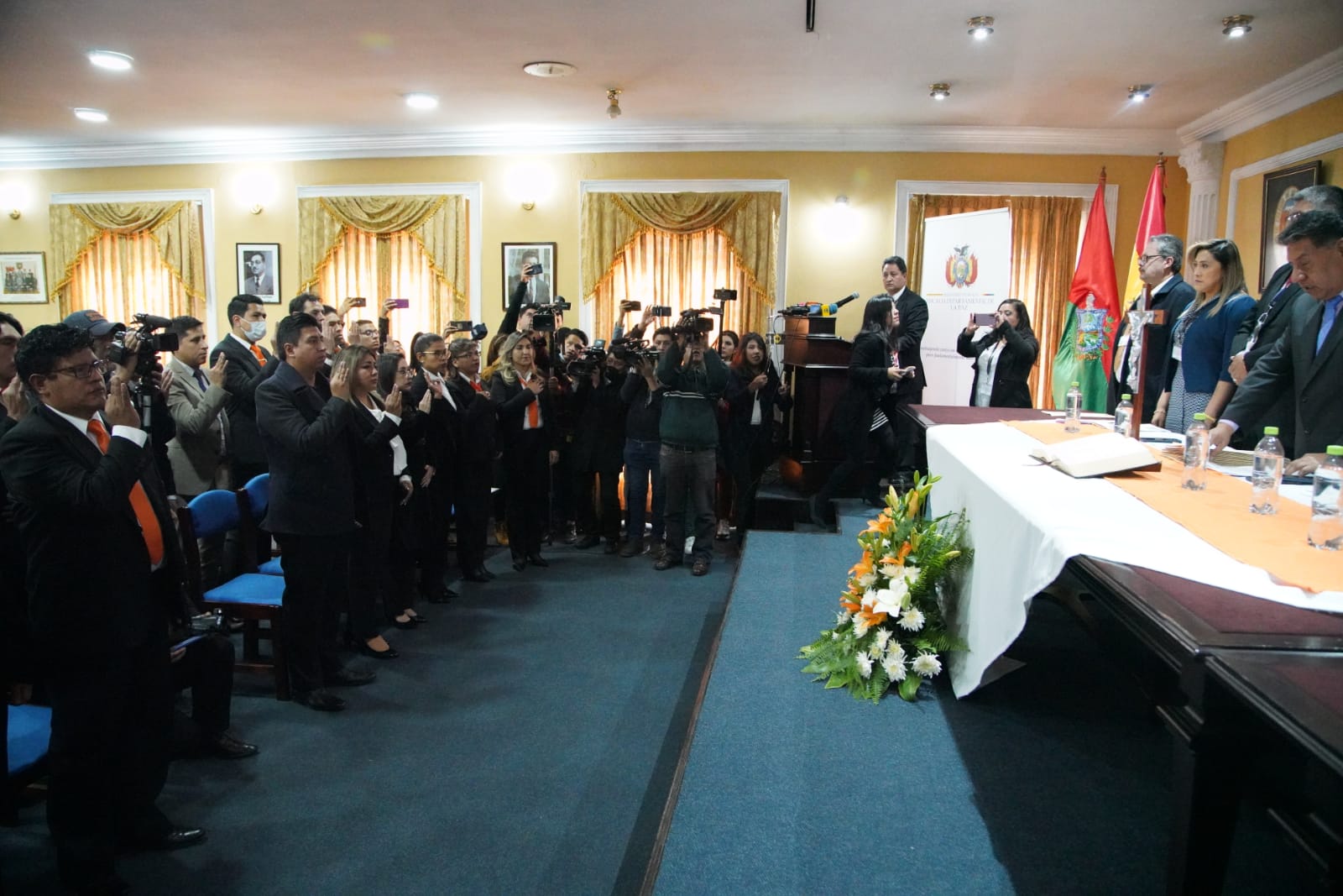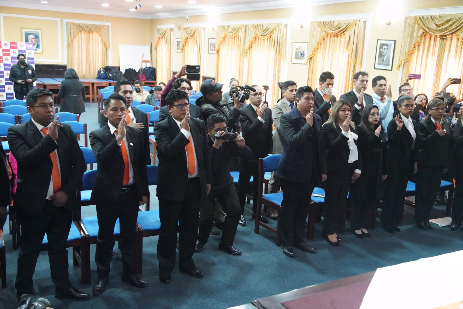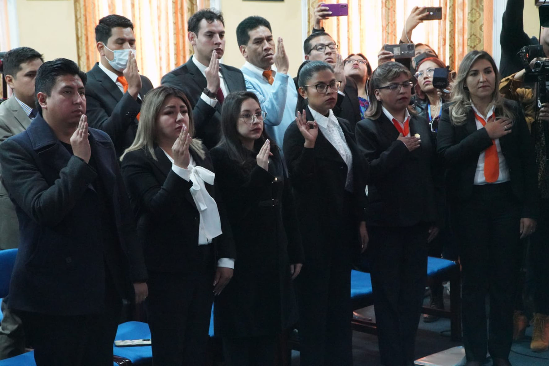 El Fiscal Departamental de La Paz, William Alave Laura, posesiona a los nuevos Fiscales Institucionalizados del Tercer Programa de Formación Inicial, en el salón de Honor del Colegio de Abogados. Fotos: Jorge Mamani
