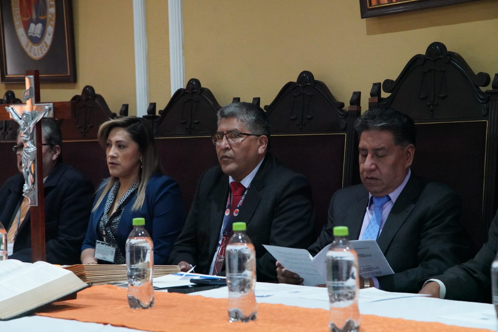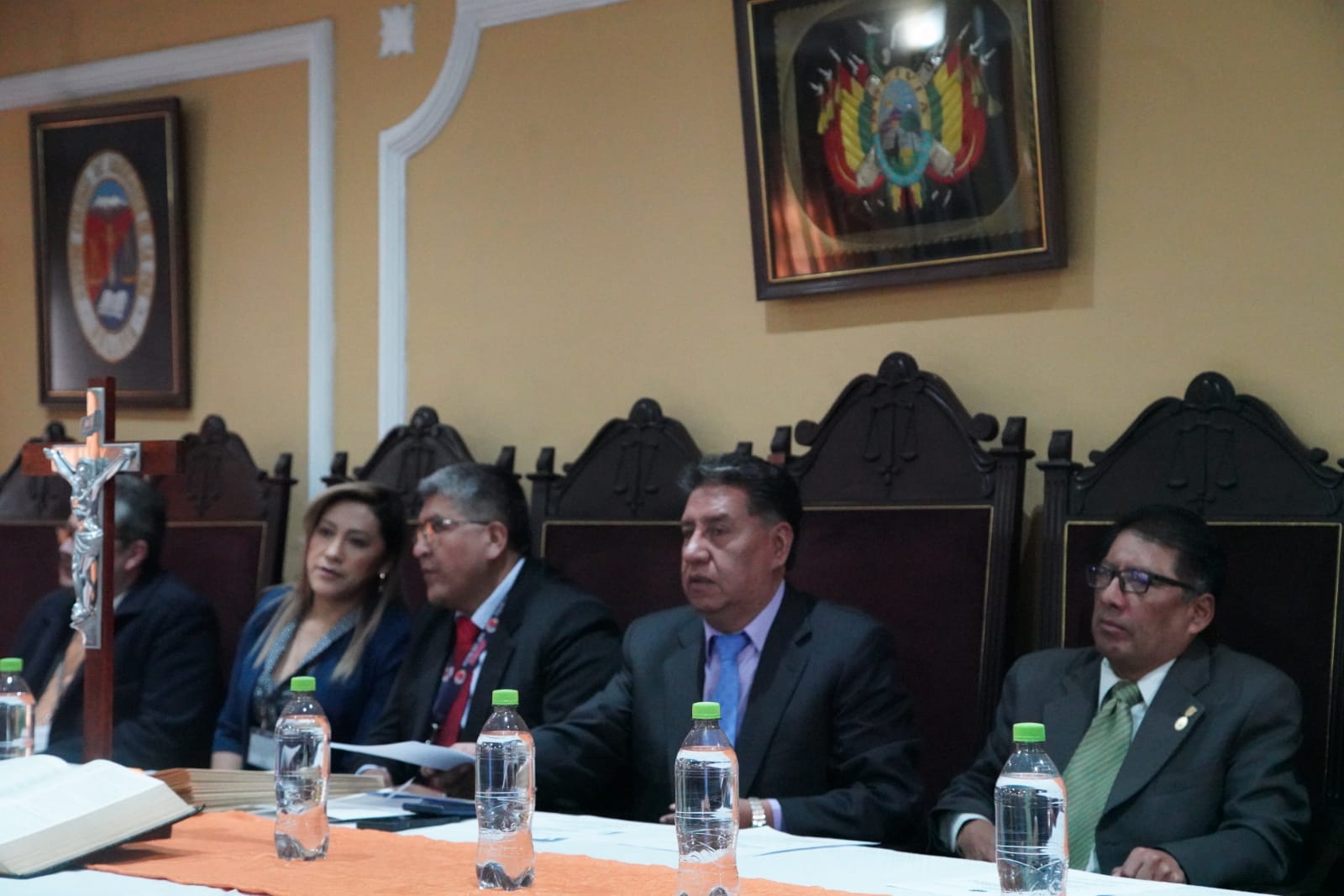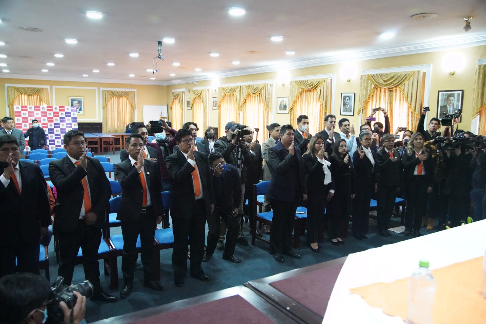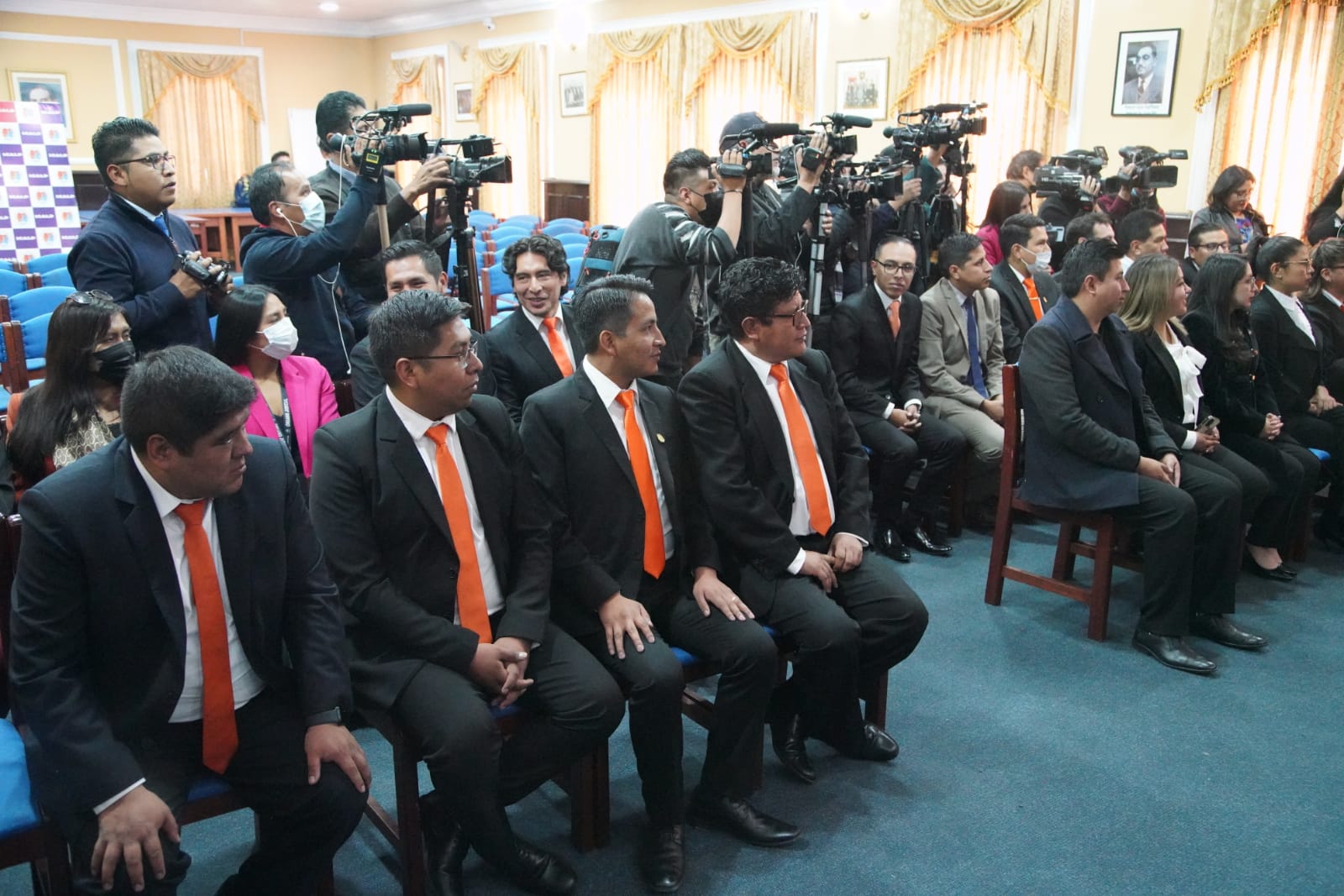 El Fiscal Departamental de La Paz, William Alave Laura, posesiona a los nuevos Fiscales Institucionalizados del Tercer Programa de Formación Inicial, en el salón de Honor del Colegio de Abogados. Fotos: Jorge Mamani