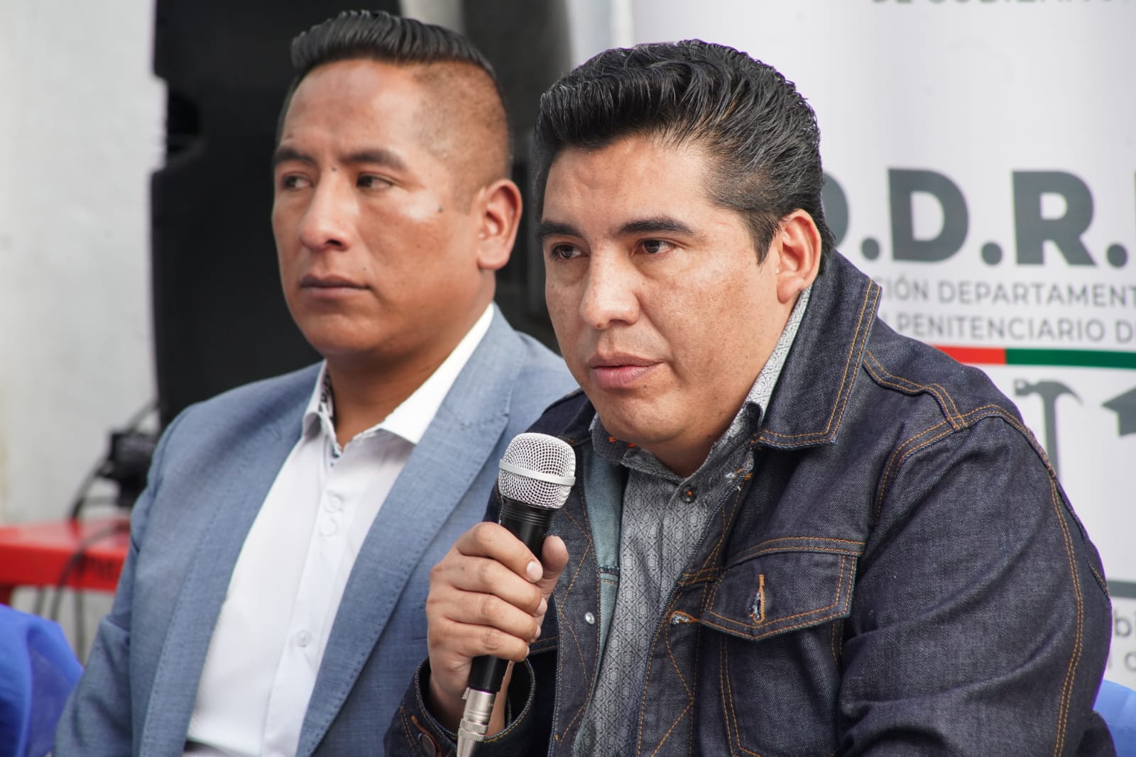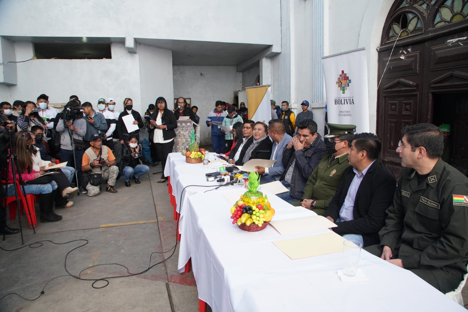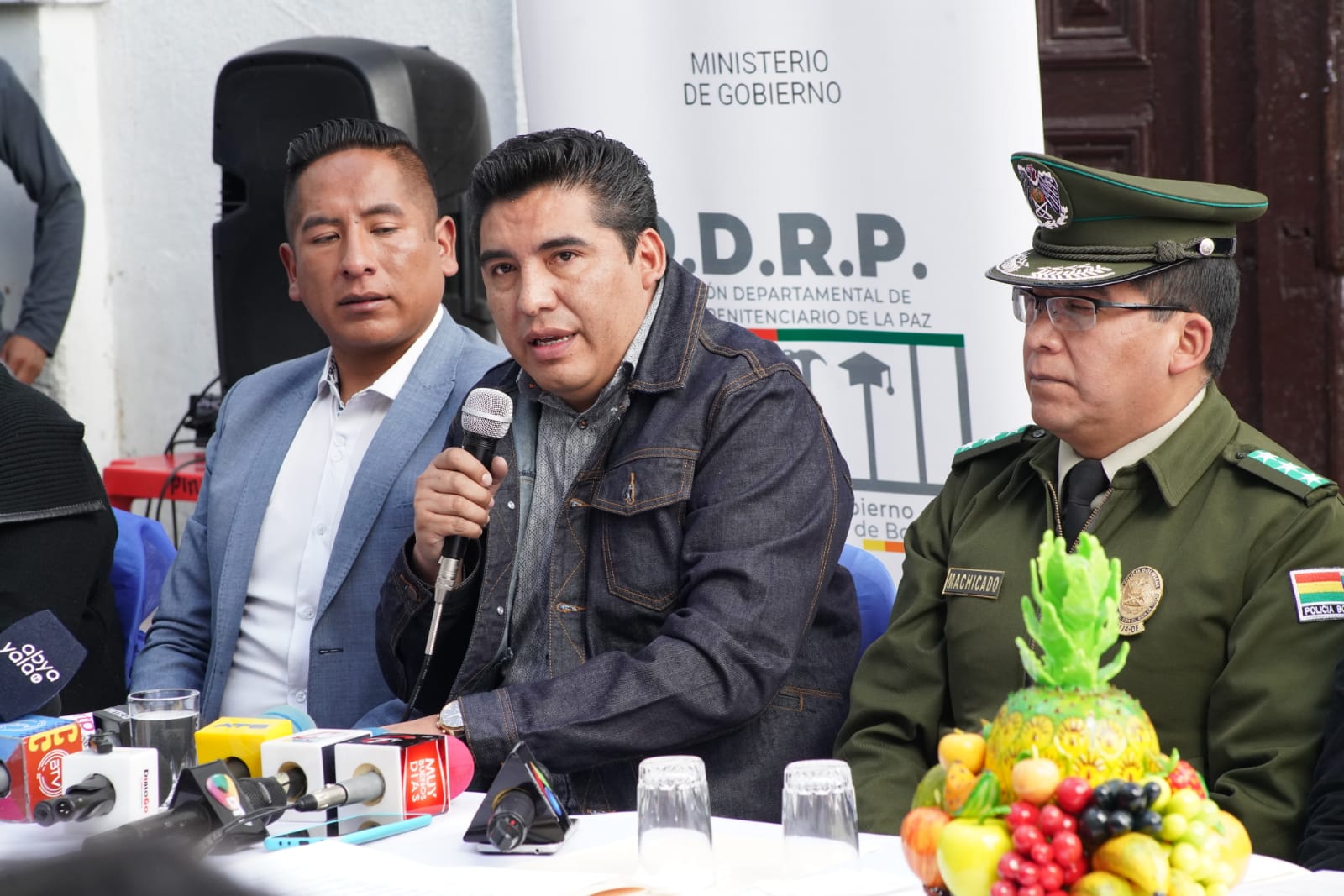 El Director General de Régimen Penitenciario Juan Carlos Limpias, y el Cnl. Rodolfo Machicado, Director Nacional de Seguridad Penitenciaria, participan del acto de inauguración y relanzamiento de la clínica Jurídica para la asistencia legal de los privados de libertad en el penal de San Pedro. Fotos: Jorge Mamani
