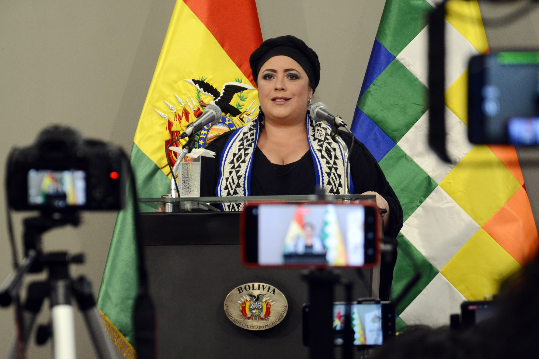 Ministra de la Presidencia María Nela Prada en conferencia de prensa en Casa Grande del Pueblo