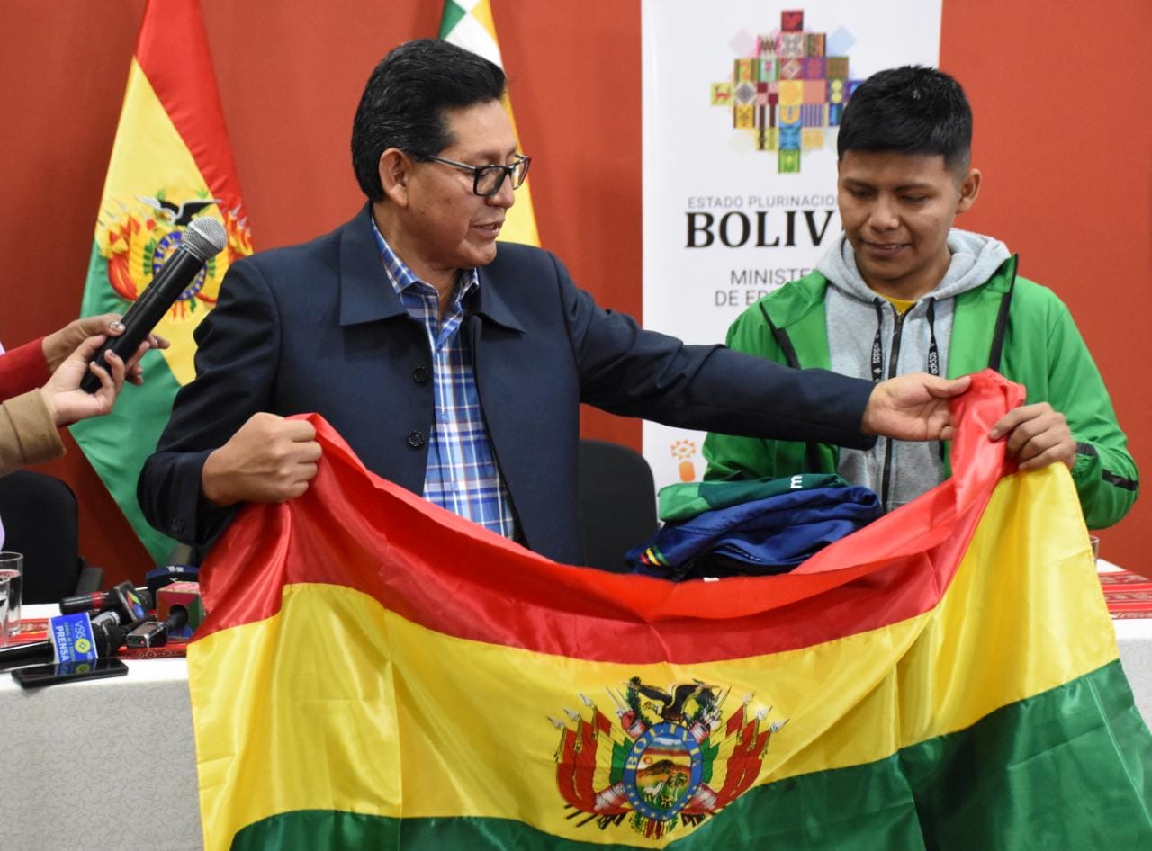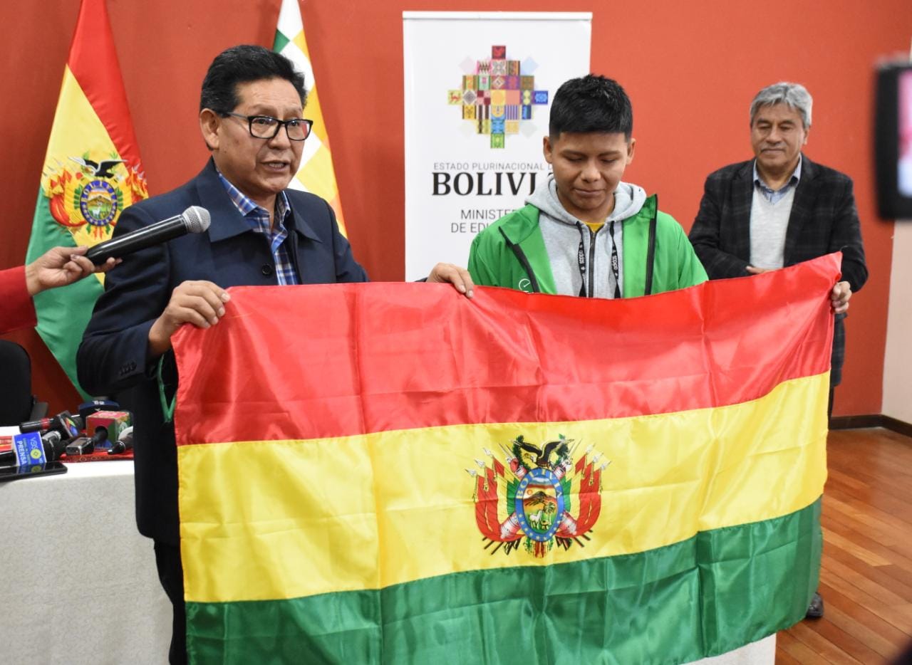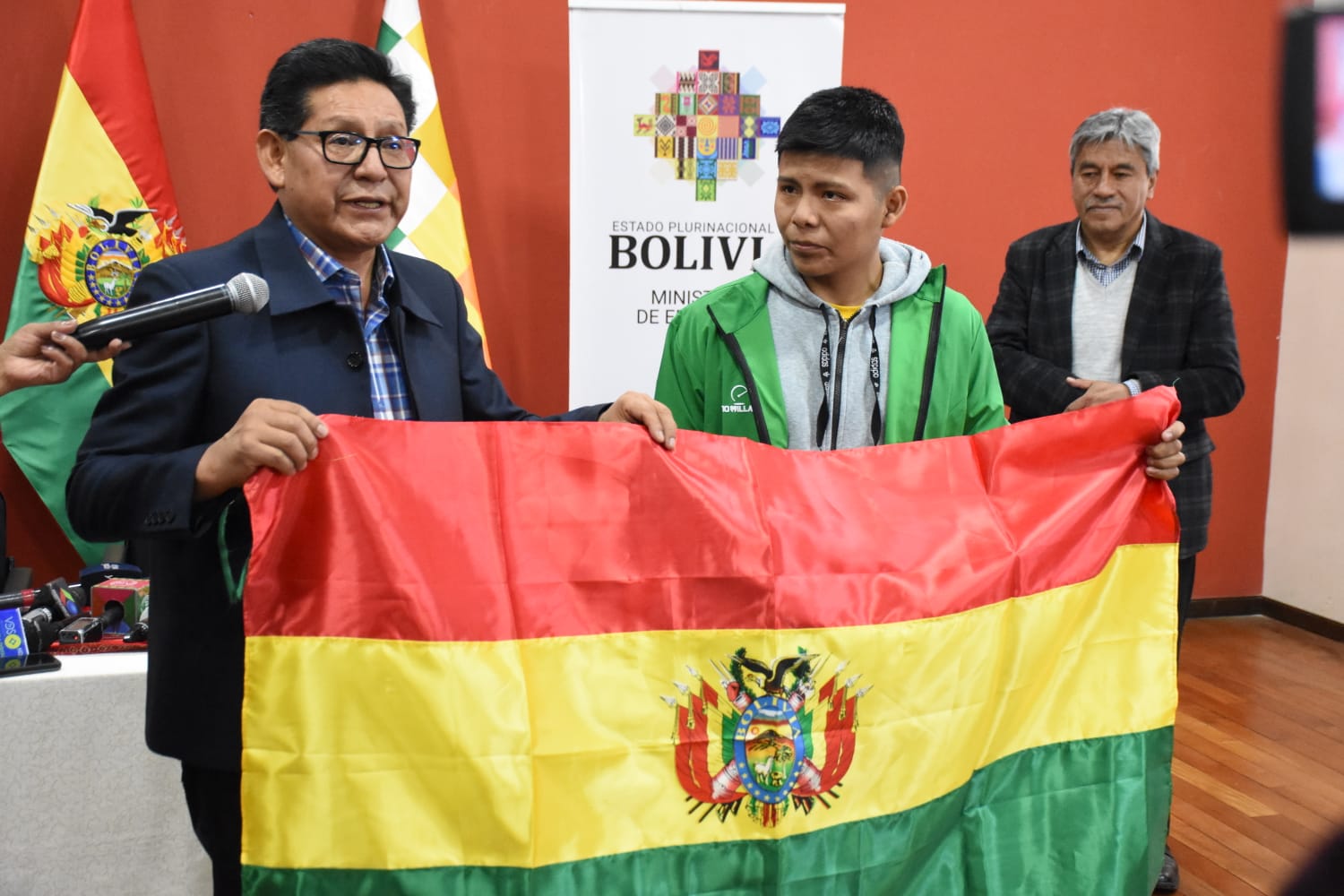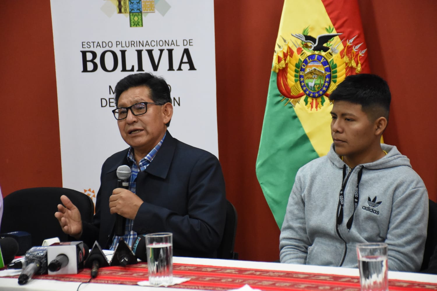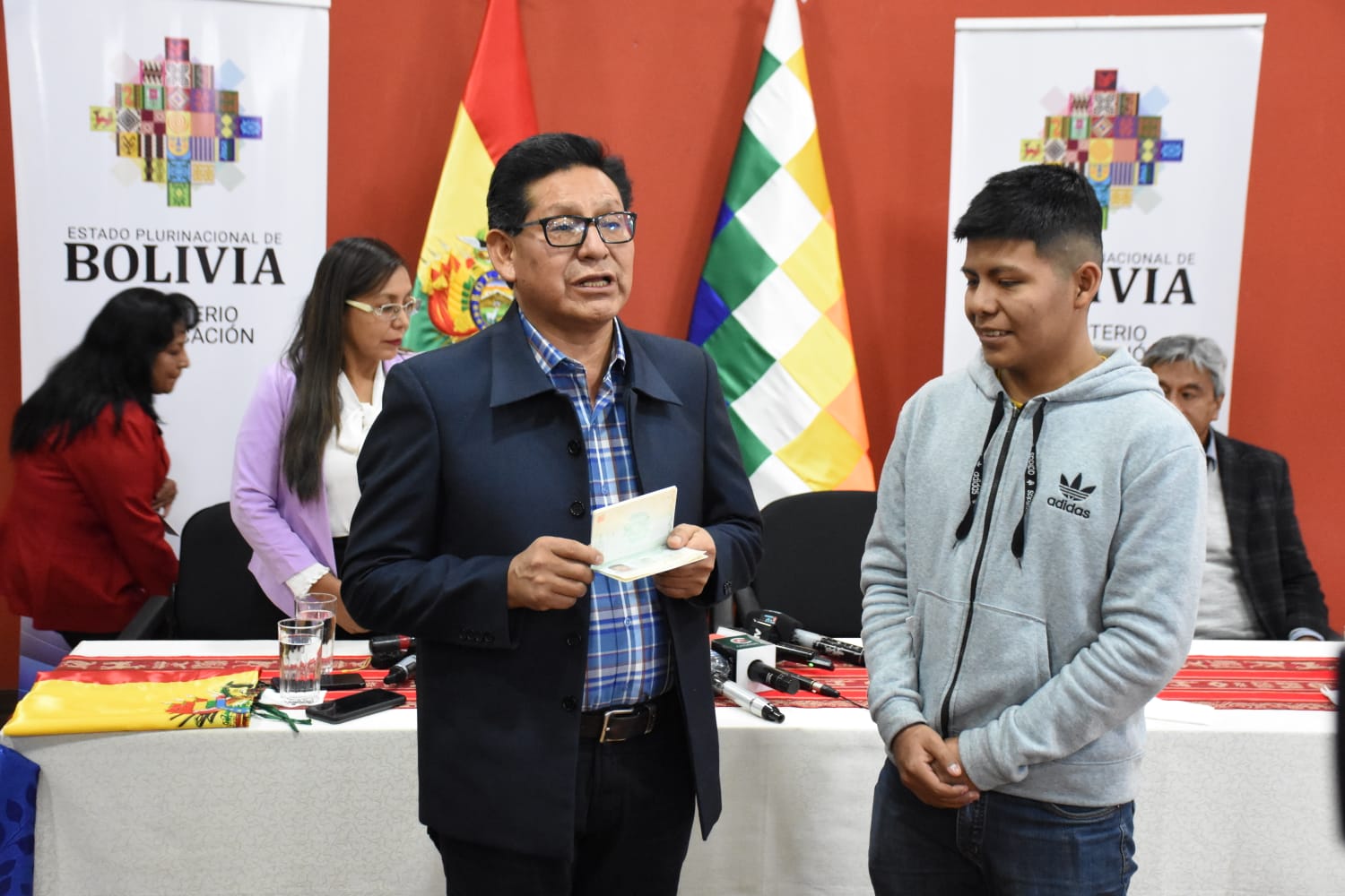 El ministro de Educación Edgar Pary entregó a José Ernesto García (el genio boliviano), Ayuda para su estadía además pasaporte, ropa deportiva y una computadora. Fotos: Jorge Mamani