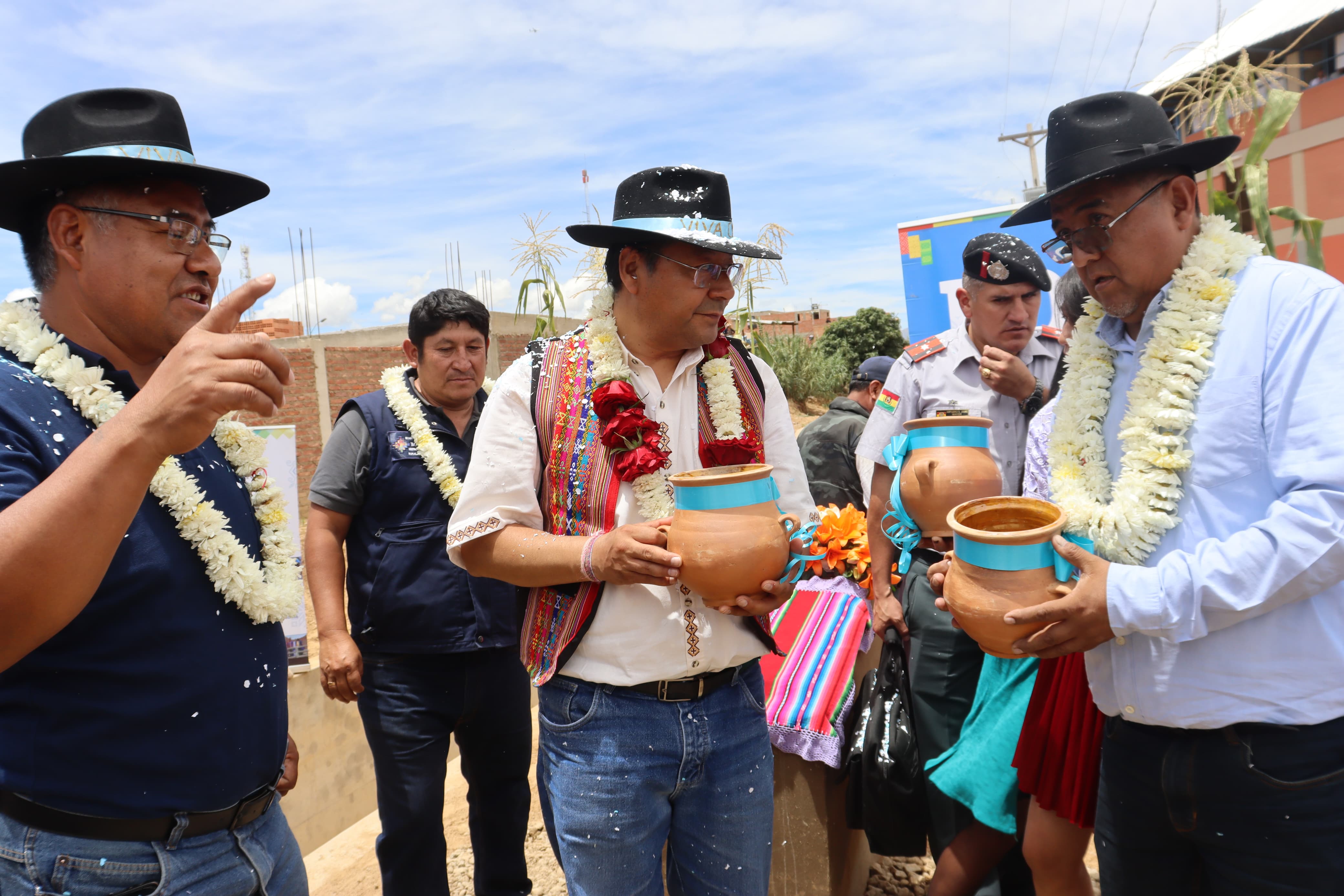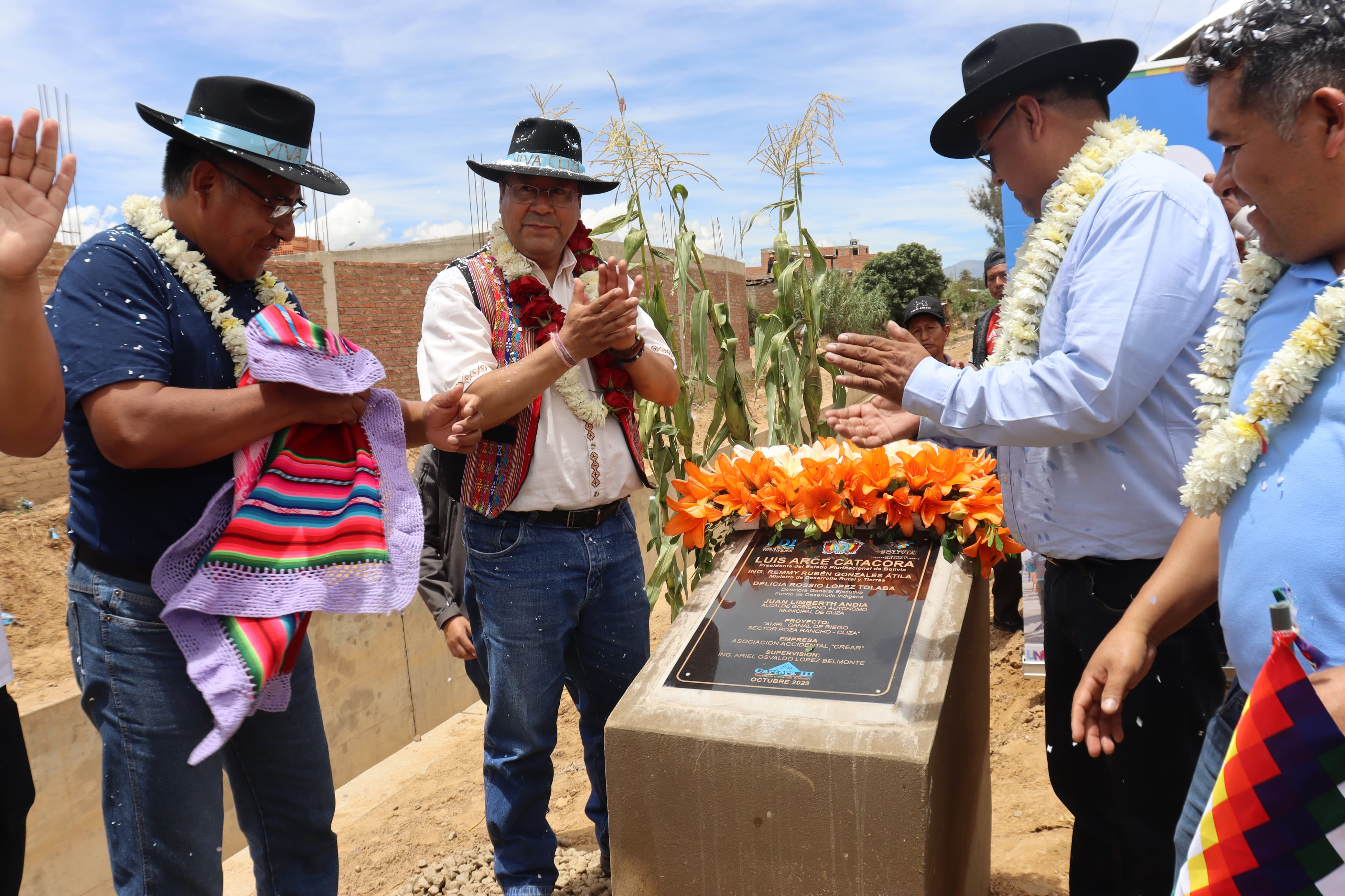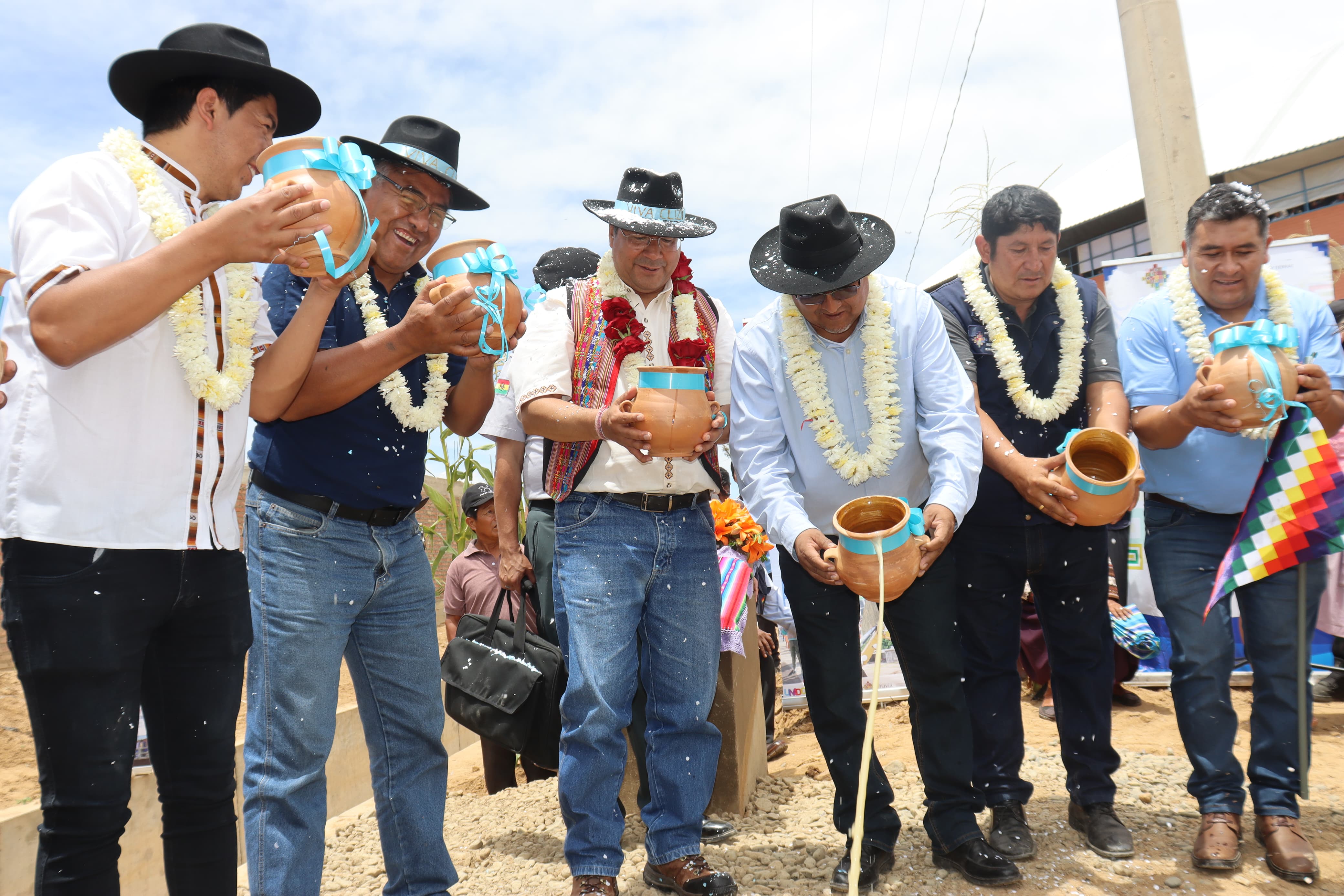 El presidente del Estado, Luis Arce, ch'alla la Unidad Educativa Villa El Carmen y el Proyecto de Ampliación del Canal de Riego Sector Poza Rancho, en el municipio de Cliza, Cochabamba