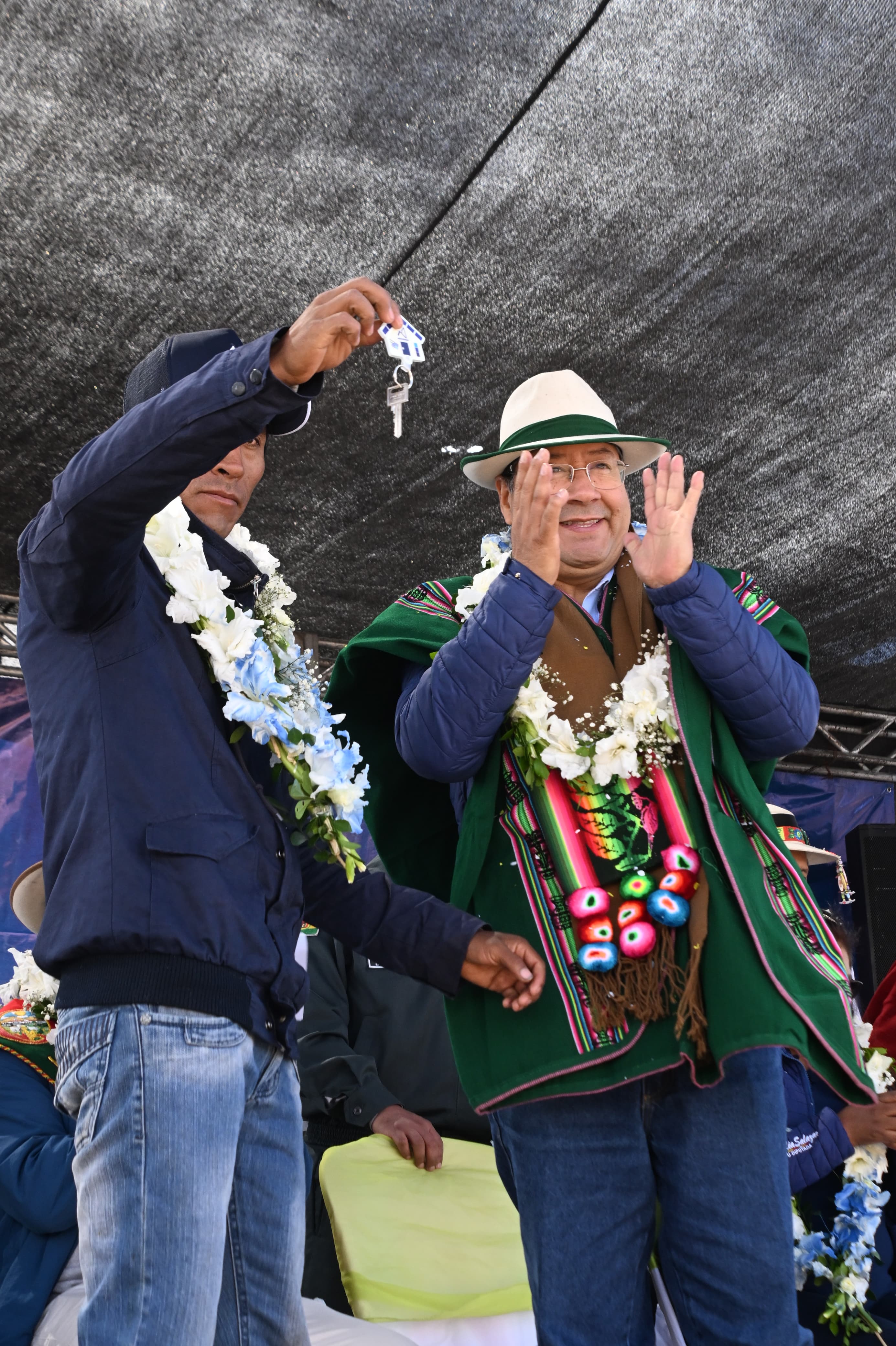 El Presidente del Estado Plurinacional de Bolivia, Luis Arce Catacora, entrega viviendas, sistemas de agua subterránea, radio bases, ampliación de unidad educativa y un proyecto de enlosetado en Santuario de Quillacas, Oruro