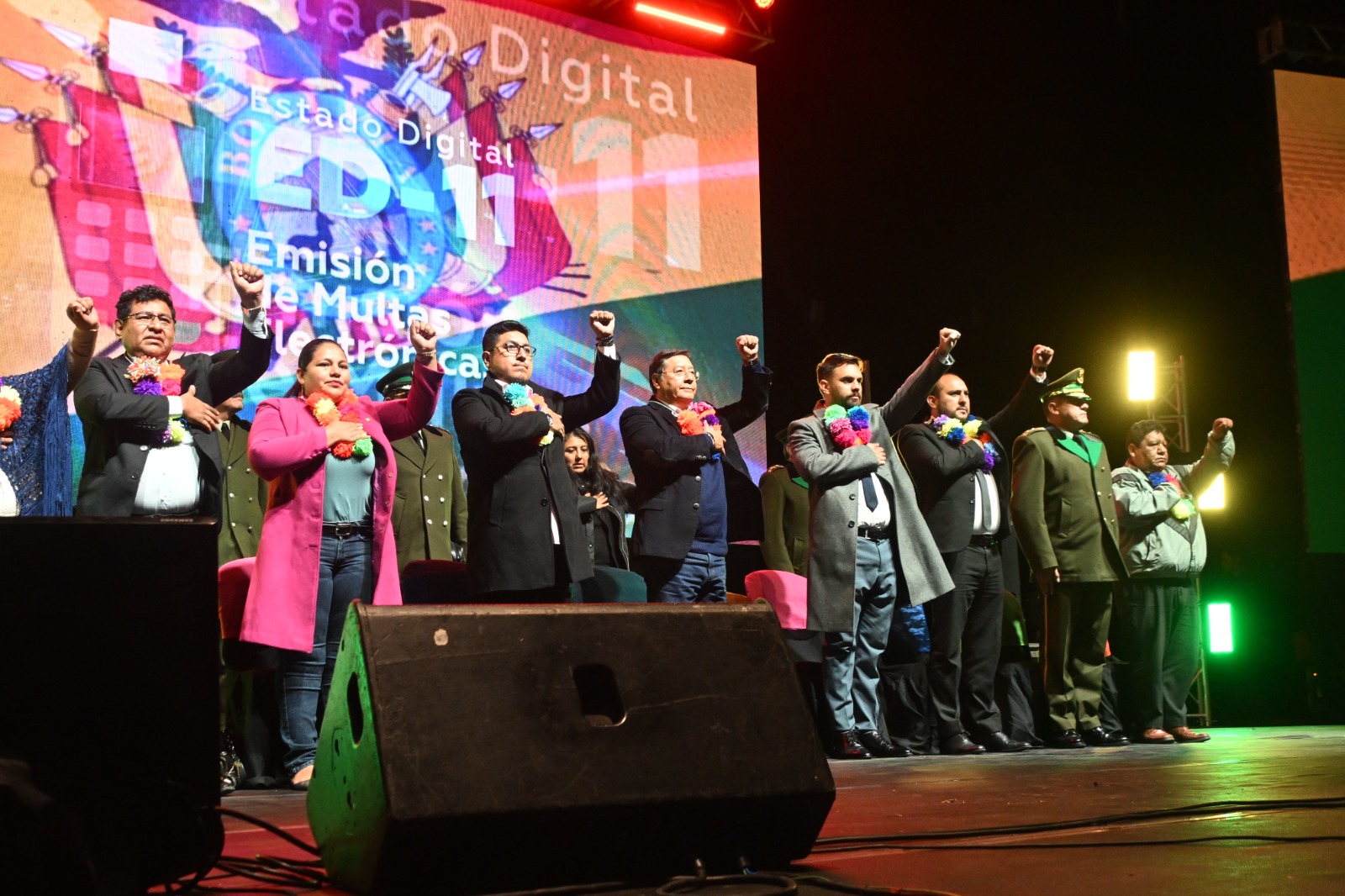 El Presidente del Estado Plurinacional de Bolivia, Luis Arce Catacora, lanza los Dispositivos para Emisión de Multas Electrónicas ED-11 en el Parque de las Culturas de La Paz