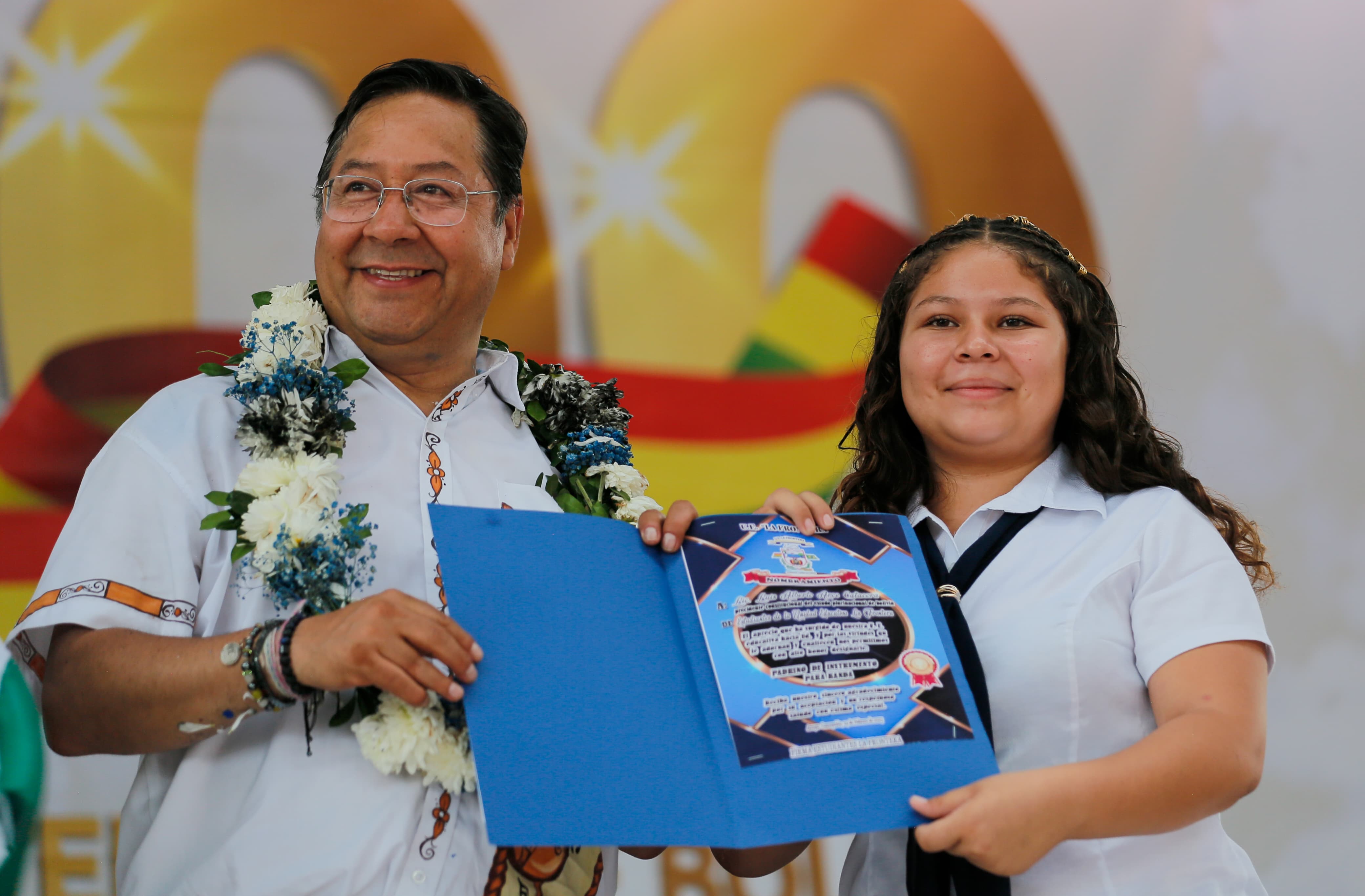 El Presidente del Estado Plurinacional de Bolivia, Luis Arce Catacora, entrega las unidades educativas La Frontera y Santa Cruz, además de viviendas y maquinaria pesada en Puerto Quijarro, Santa Cruz