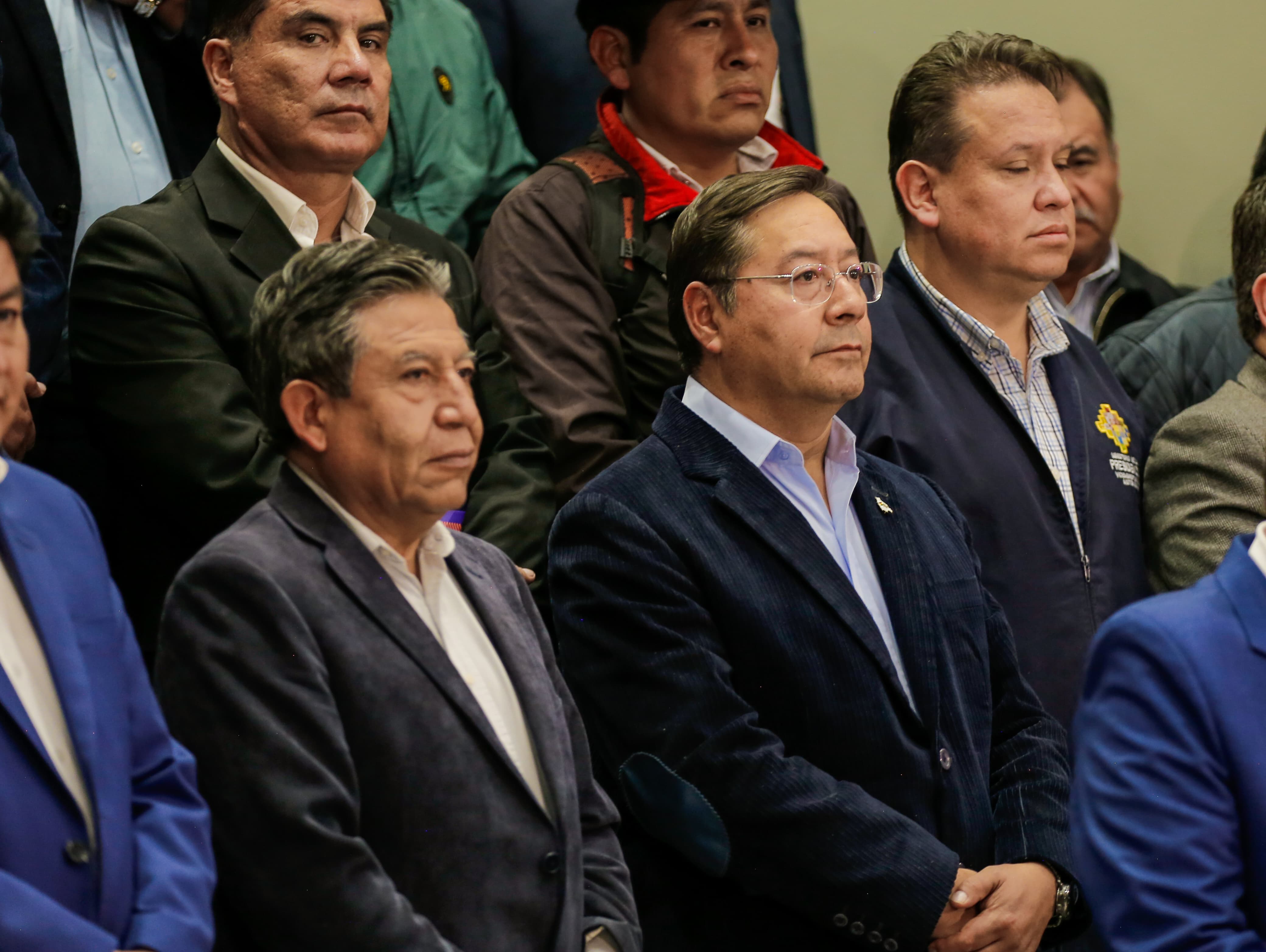 El Presidente del Estado Plurinacional de Bolivia, Luis Arce Catacora, participa en la conferencia de prensa del Consejo Nacional de Autonomías Extraordinario, en el Hall de la Casa Grande del Pueblo