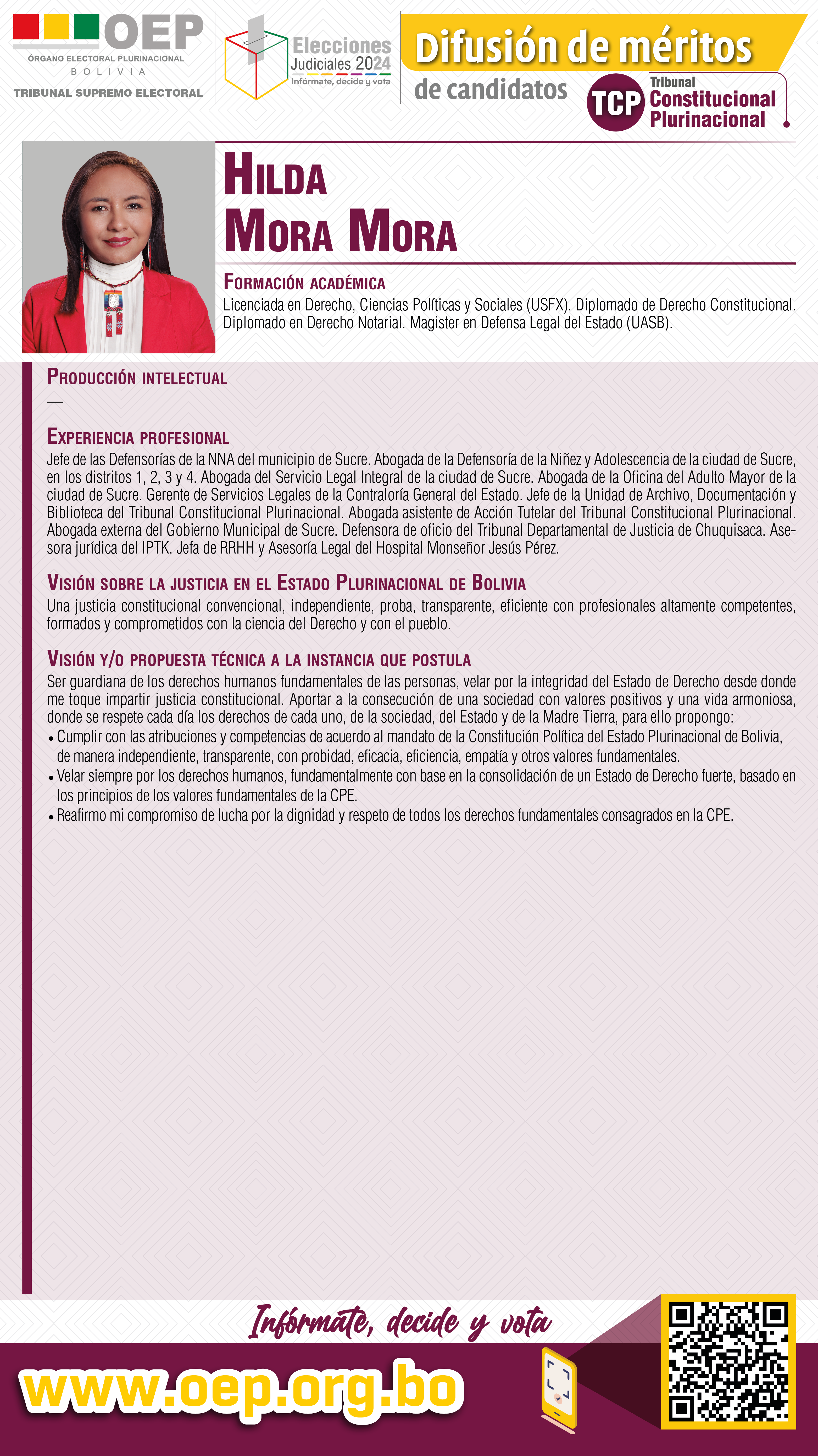 ELECCIONES JUDICIALES: Conozca a la candidata al TCP por Chuquisaca, Hilda Mora Mora