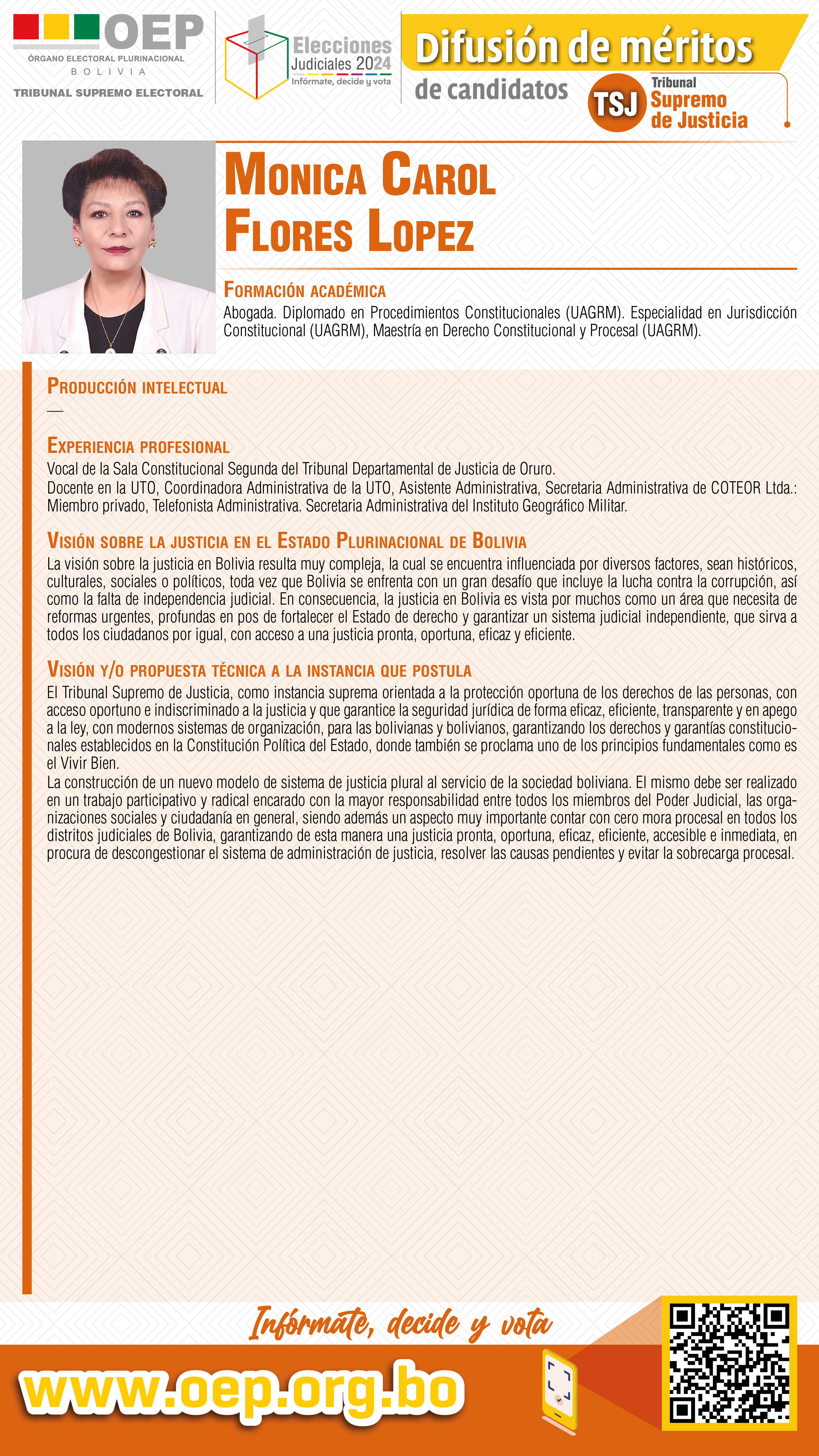 ELECCIONES JUDICIALES: Conozca a la candidata al TSJ por Oruro, Monica Carol Flores Lopez