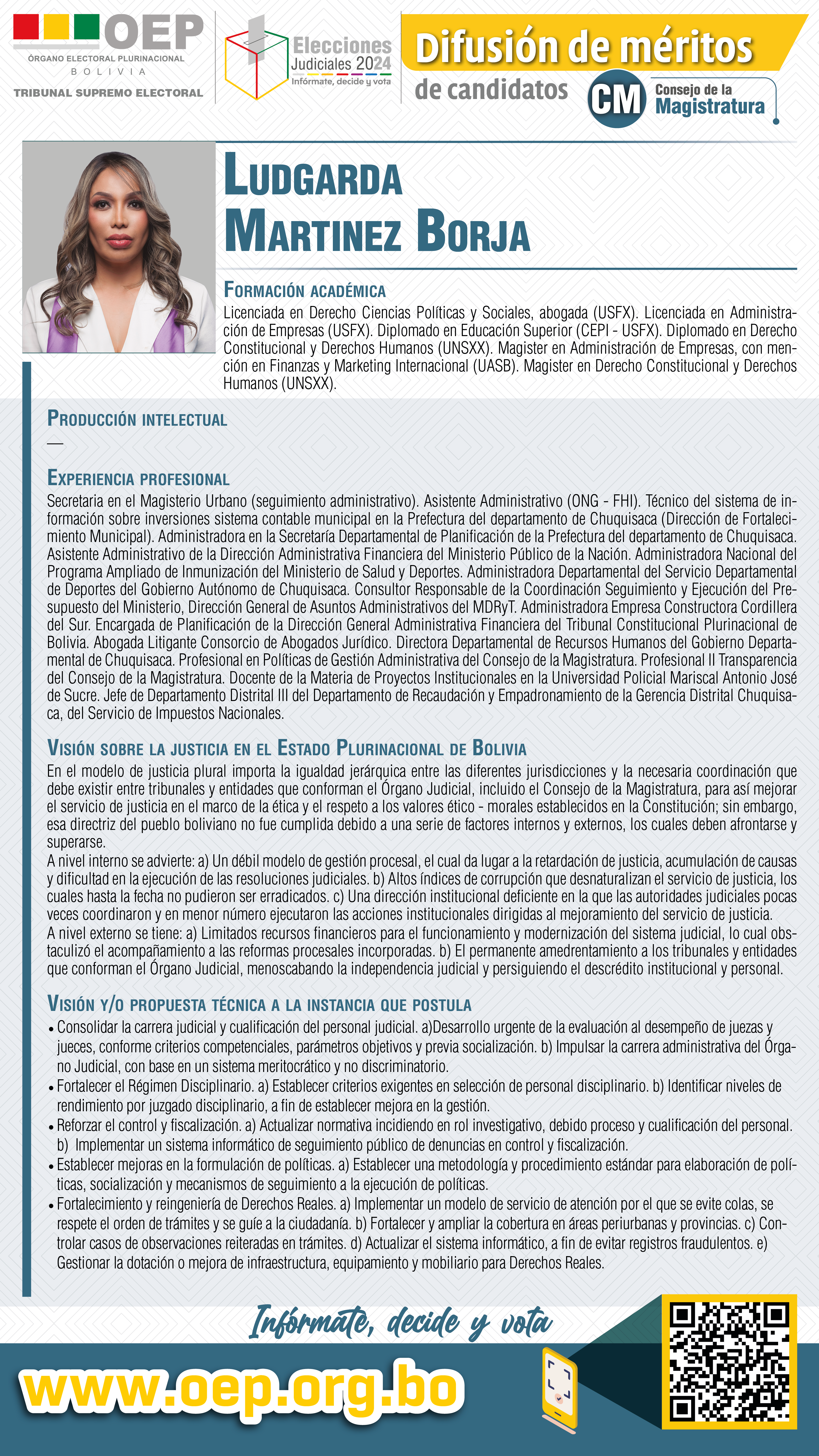 Espacio solicitado: Conforme a lo establecido en el Artículo 10 "Difusión de méritos" del “Reglamento de Difusión de Méritos e Información del Proceso de Elección de Autoridades del Órgano Judicial y del Tribunal Constitucional Plurinacional 2024”, (aprobado Mediante Resolución TSE-RSP-ADM N° 301/2024 de 27 de agosto de 2024), que señala que “Los medios de comunicación del Estado deben establecer espacios gratuitos para la difusión de méritos de las candidatas y los candidatos, garantizando que tengan el mismo tiempo y condiciones".