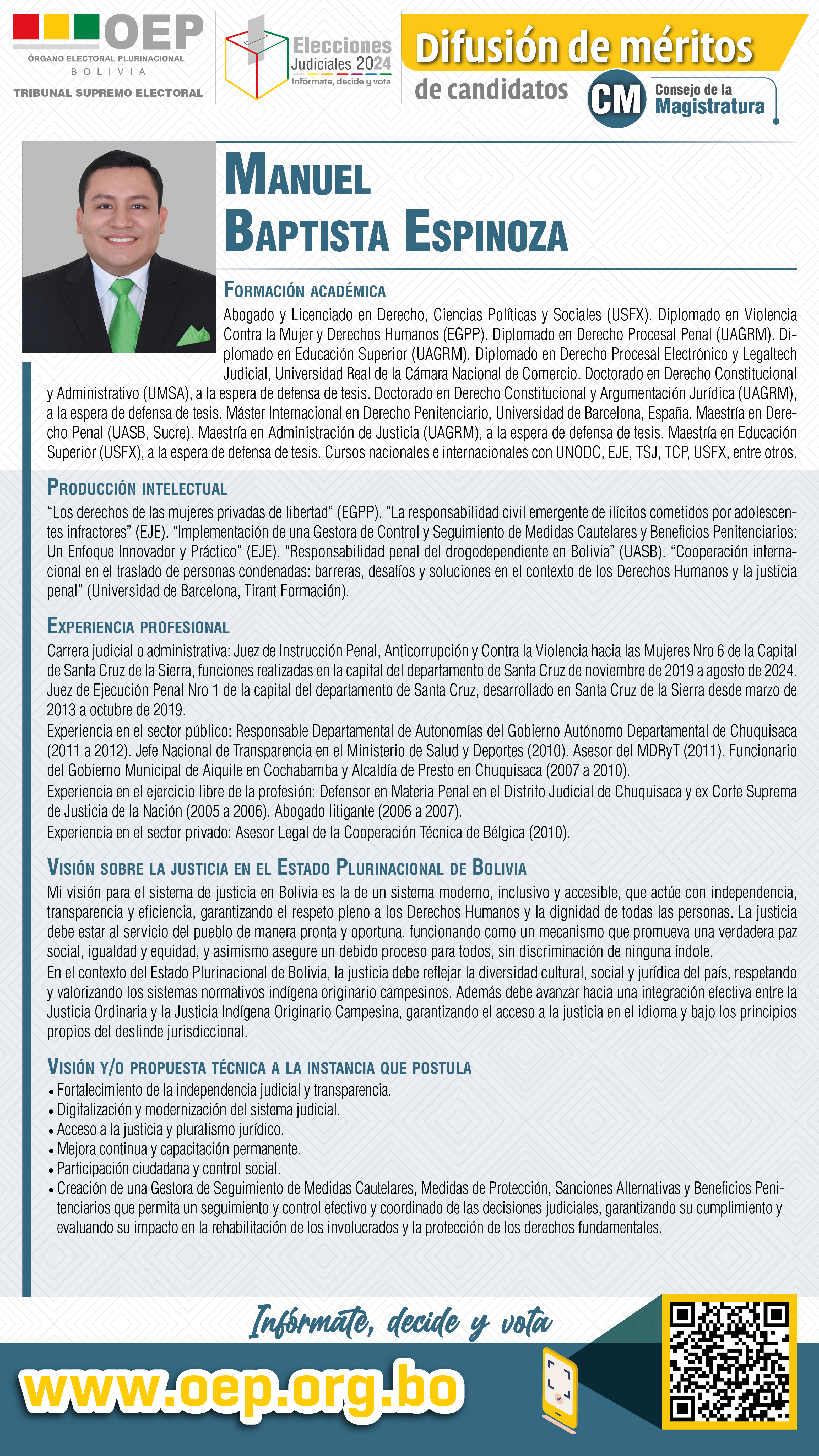 Espacio solicitado: Conforme a lo establecido en el Artículo 10 "Difusión de méritos" del “Reglamento de Difusión de Méritos e Información del Proceso de Elección de Autoridades del Órgano Judicial y del Tribunal Constitucional Plurinacional 2024”, (aprobado Mediante Resolución TSE-RSP-ADM N° 301/2024 de 27 de agosto de 2024), que señala que “Los medios de comunicación del Estado deben establecer espacios gratuitos para la difusión de méritos de las candidatas y los candidatos, garantizando que tengan el mismo tiempo y condiciones".