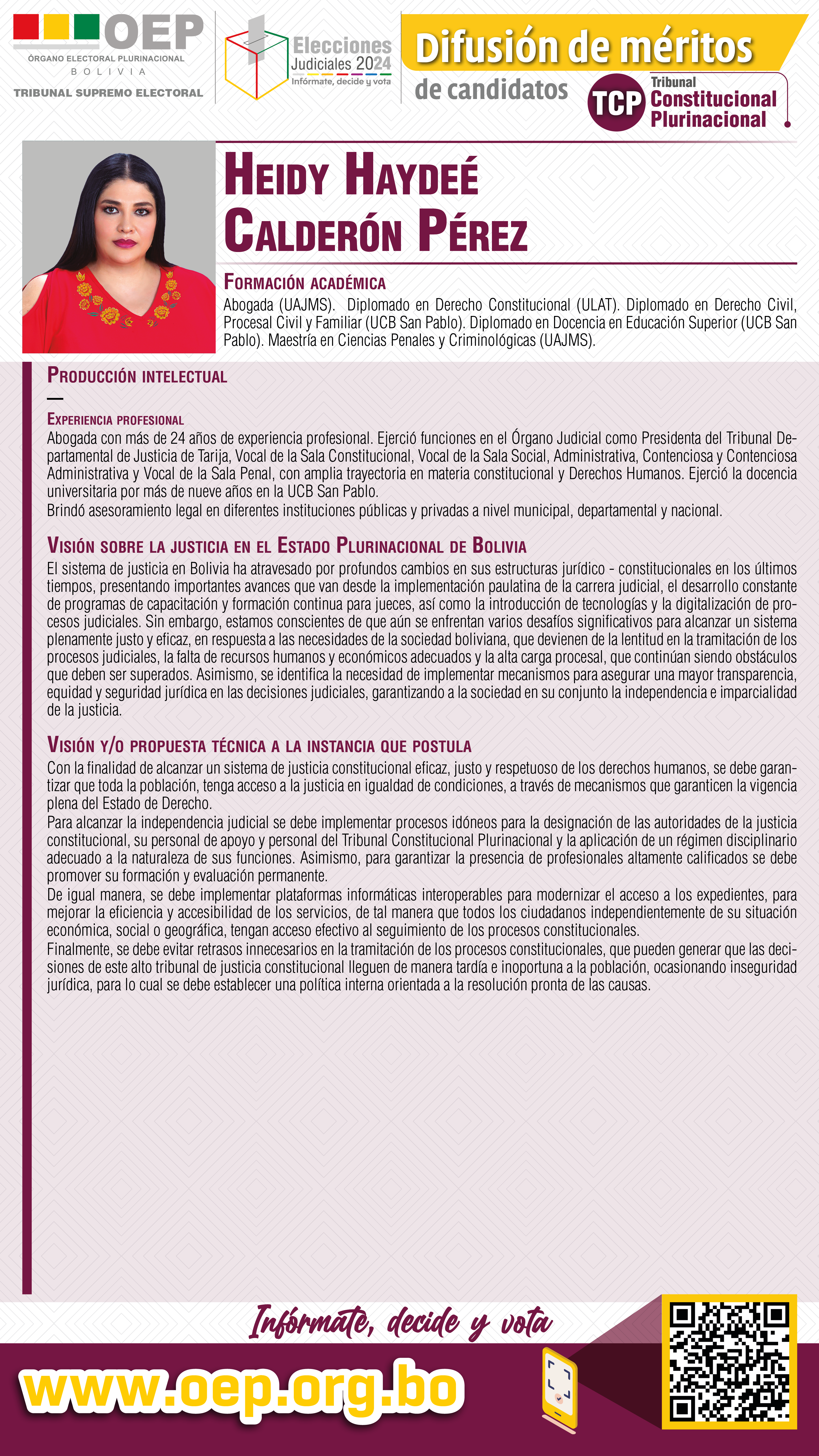 ELECCIONES JUDICIALES: Conozca a la candidata al TCP por Tarija, Heidy Haydeé Calderón PérezRedacción centralPolitica 14 Noviembre 2024 Visto: 772ShareTwittearshare with Whatsappshare with Telegram Leer más: ELECCIONES...