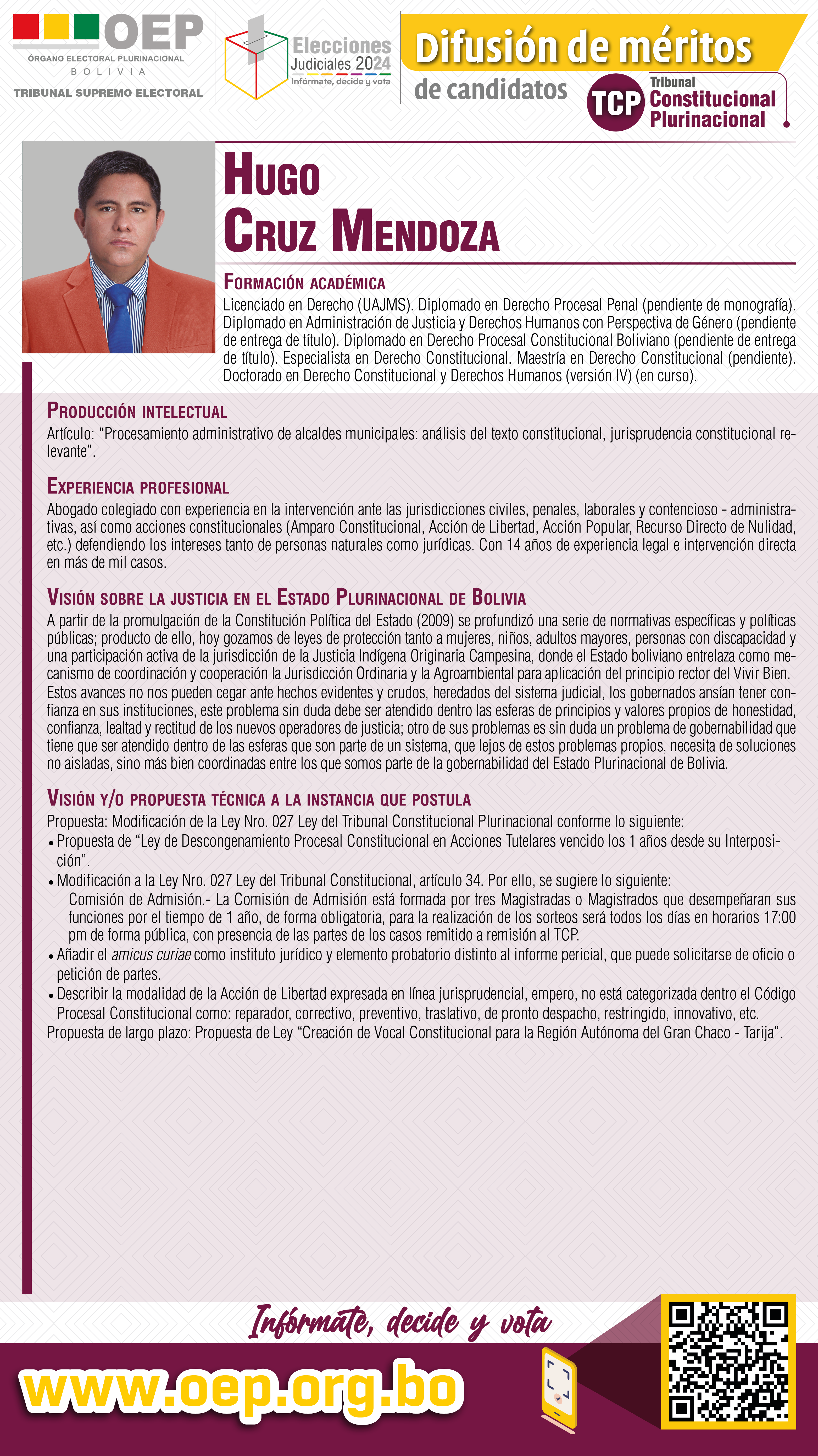 ELECCIONES JUDICIALES: Conozca al candidato al TCP por Tarija, Hugo Cruz MendozaRedacción centralPolitica 14 Noviembre 2024 Visto: 706ShareTwittearshare with Whatsappshare with Telegram Leer más: ELECCIONES...