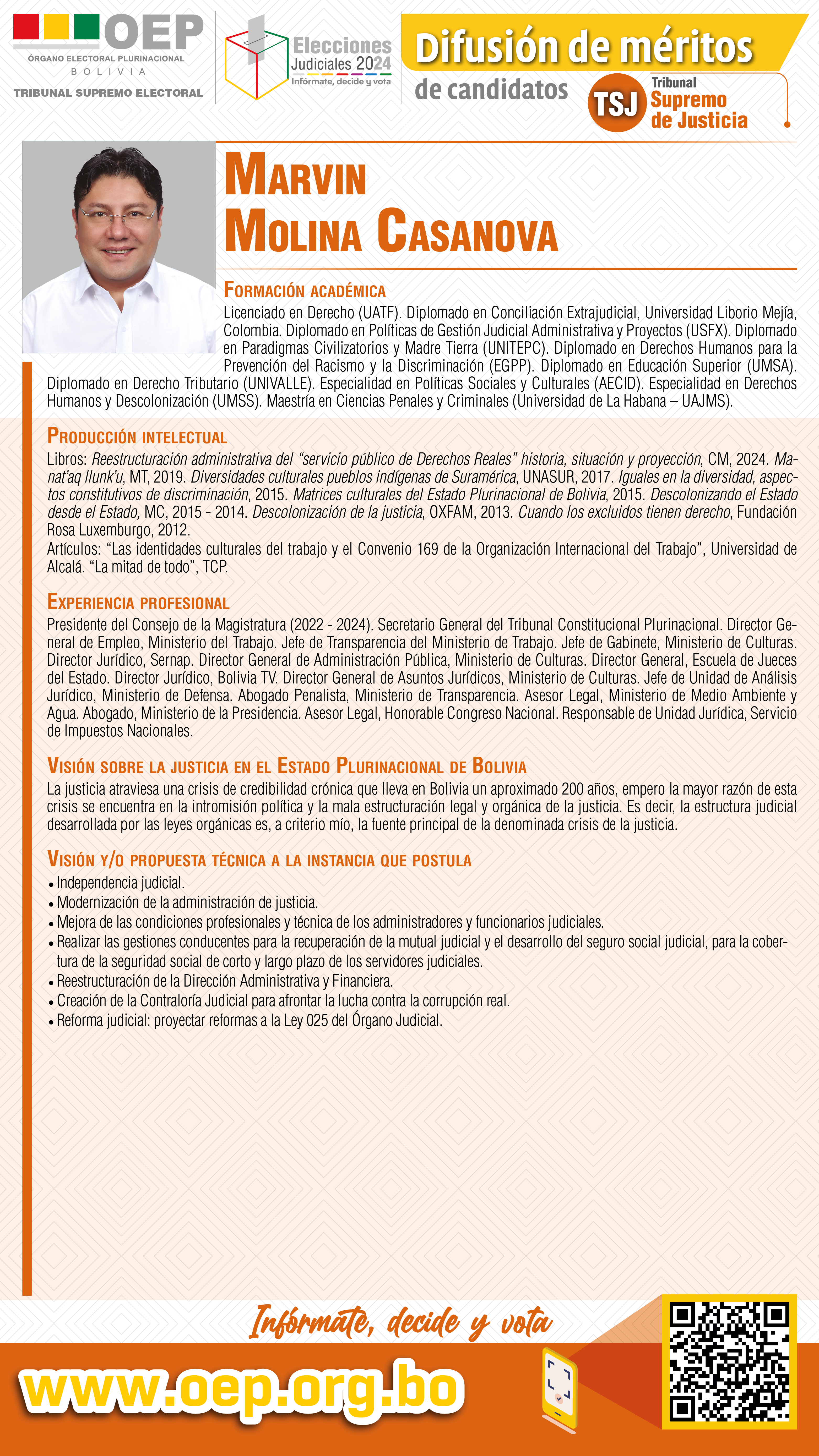 ELECCIONES JUDICIALES: Conozca al candidato al TSJ por Potosí, Marvin Molina CasanovaRedacción centralPolitica 13 Noviembre 2024 Visto: 946ShareTwittearshare with Whatsappshare with Telegram Leer más: ELECCIONES...