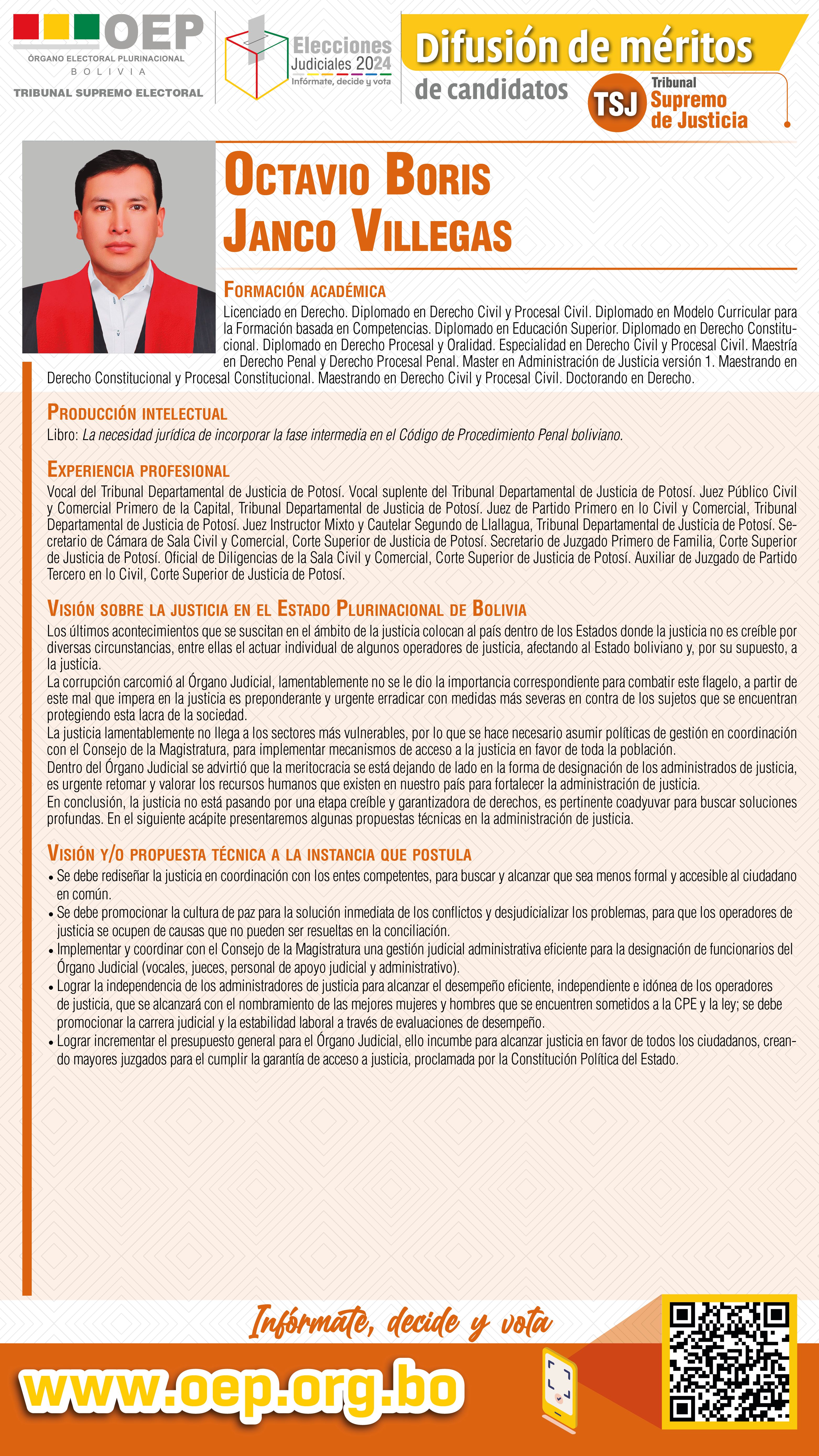 ELECCIONES JUDICIALES: Conozca al candidato al TSJ por Potosí, Octavio Boris Janco VillegasRedacción centralPolitica 13 Noviembre 2024 Visto: 1213ShareTwittearshare with Whatsappshare with Telegram Leer más: ELECCIONES...