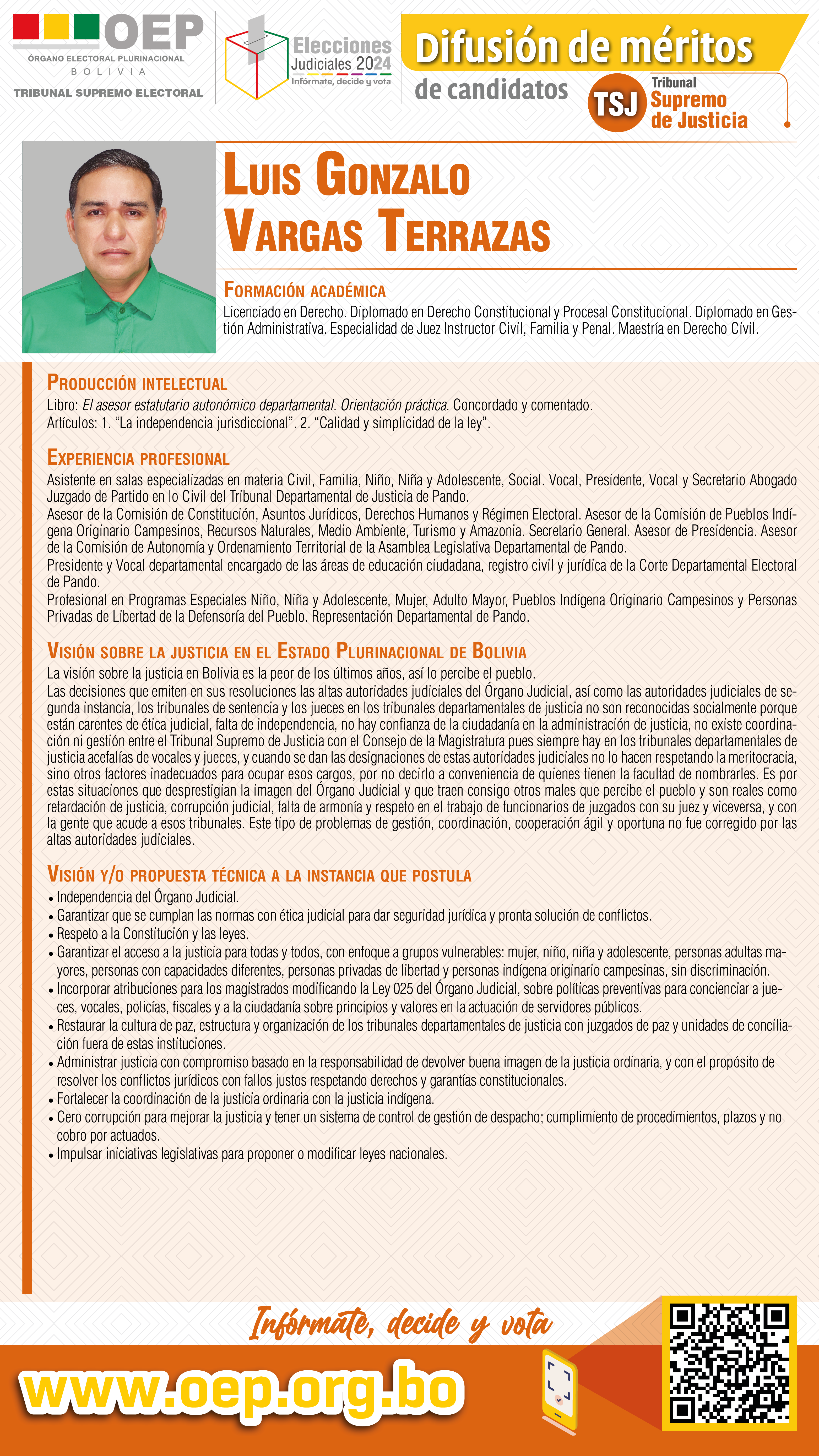 ELECCIONES JUDICIALES: Conozca al candidato al TSJ por Pando, Luis Gonzalo Vargas TerrazasRedacción centralPolitica 12 Noviembre 2024 Visto: 1091ShareTwittearshare with Whatsappshare with Telegram Leer más: ELECCIONES...