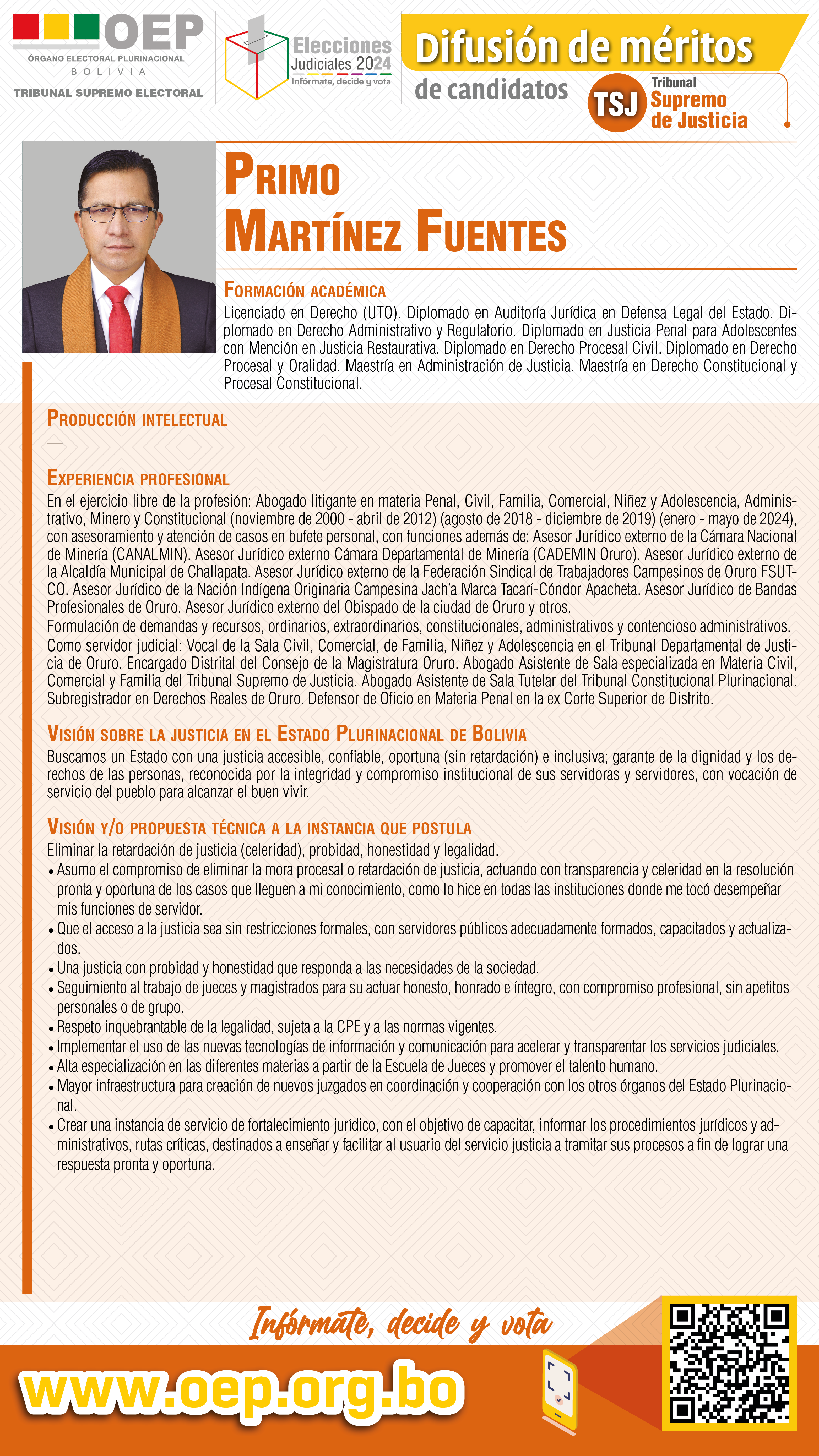 ELECCIONES JUDICIALES: Conozca al candidato al TSJ por Oruro, Primo Martínez FuentesRedacción centralPolitica 11 Noviembre 2024 Visto: 1484ShareTwittearshare with Whatsappshare with Telegram Leer más: ELECCIONES...