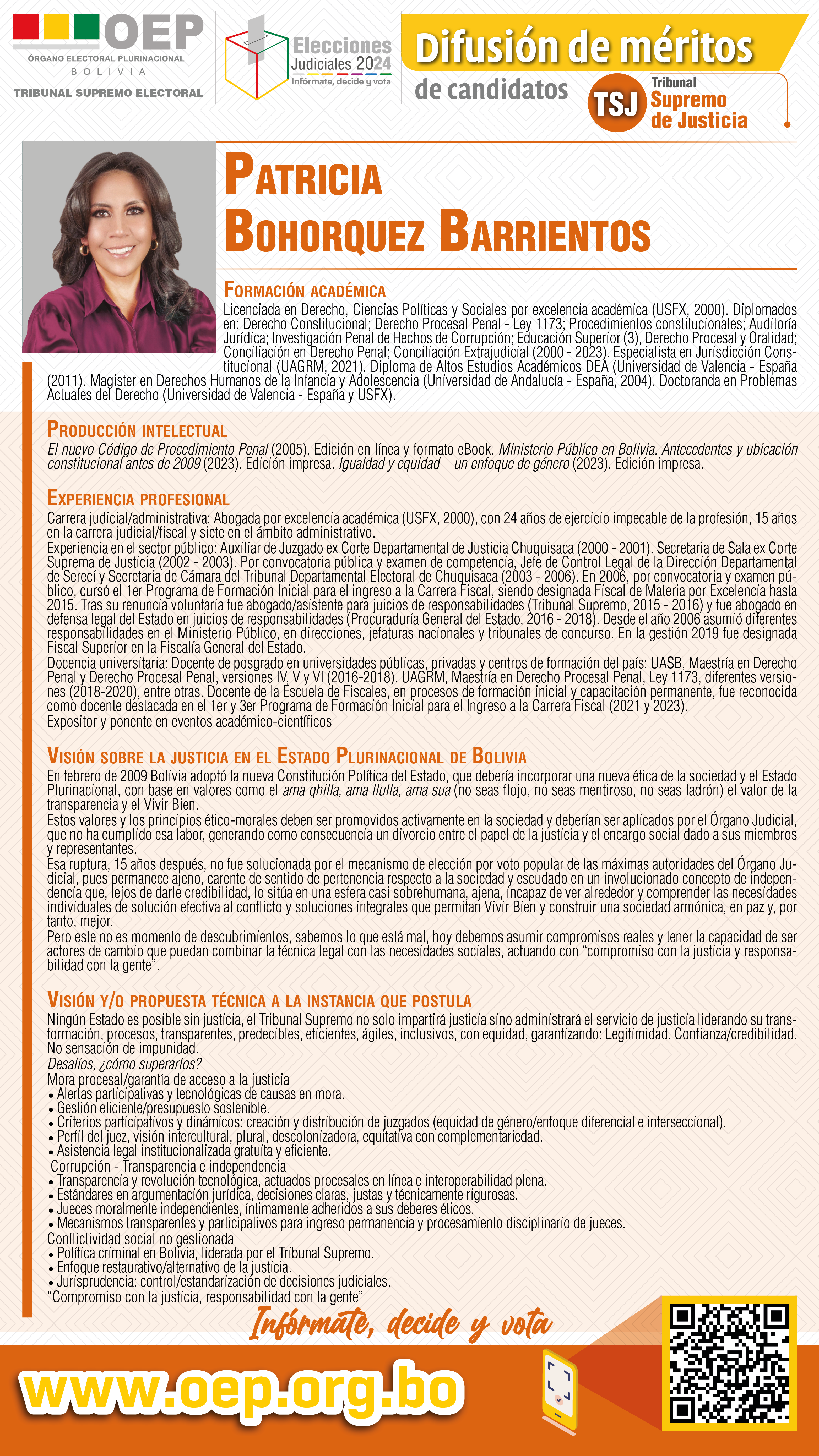 ELECCIONES JUDICIALES: Conozca a la candidata al TSJ por Chuquisaca, Patricia Bohorquez BarrientosRedacción centralPolitica 06 Noviembre 2024 Visto: 1157ShareTwittearshare with Whatsappshare with Telegram Leer más: ELECCIONES...