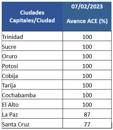 A nivel nacional, la ACE registra hasta esta fecha un 67% de avance, donde El Alto se suma a siete ciudades capitales que concluyeron con este operativo de campo: Trinidad, Sucre, Oruro, Potosí, Cobija, Tarija y Cochabamba quedando las ciudades de La Paz con un 87% y Santa Cruz con un 77%.
