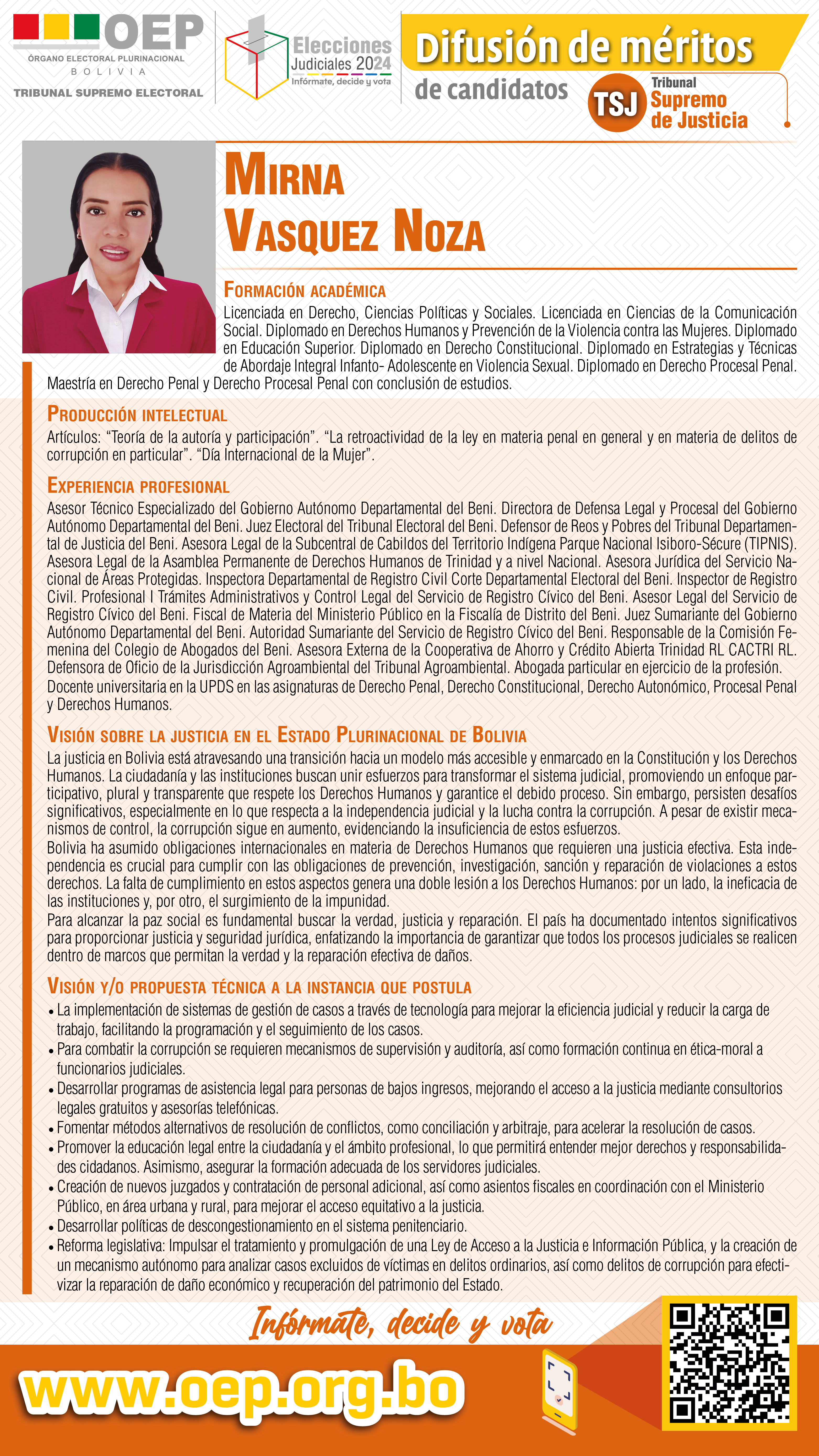 Espacio solicitado: Conforme a lo establecido en el Artículo 10 "Difusión de méritos" del “Reglamento de Difusión de Méritos e Información del Proceso de Elección de Autoridades del Órgano Judicial y del Tribunal Constitucional Plurinacional 2024”, (aprobado Mediante Resolución TSE-RSP-ADM N° 301/2024 de 27 de agosto de 2024), que señala que “Los medios de comunicación del Estado deben establecer espacios gratuitos para la difusión de méritos de las candidatas y los candidatos, garantizando que tengan el mismo tiempo y condiciones".