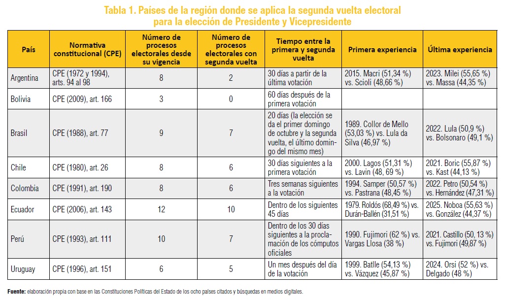 De acuerdo con datos del Tribunal Supremo Electoral (TSE), Ecuador (10), Brasil (7), y Perú (7) son los países que más veces recurrieron la segunda vuelta para elegir a su presidente. En menor medida lo hicieron Chile (6), Colombia (6), Uruguay (5) y Argentina (2).