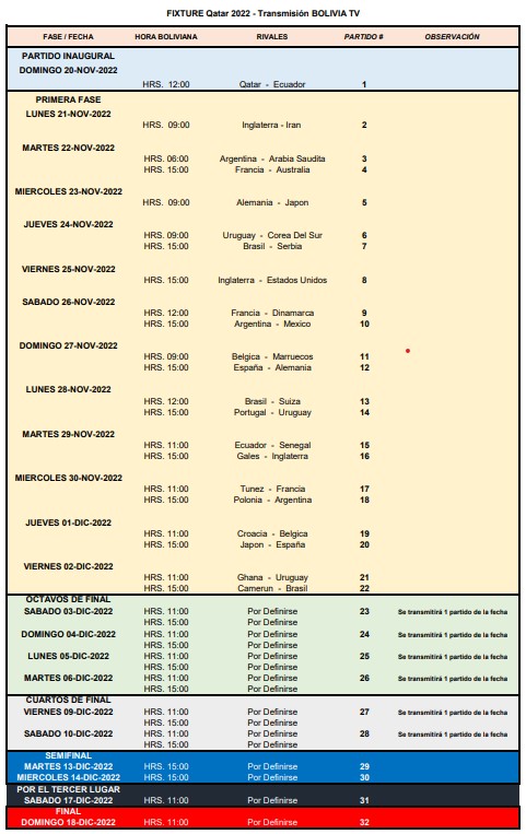 Recordó que como parte de los 32 partidos del Mundial Qatar 2022 que transmitirá Bolivia TV por señal abierta, la población podrá disfrutar de los dos eventos principales, el inaugural y el final.
