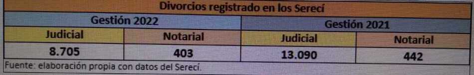 El Serecí, que depende del Tribunal Supremo Electoral (TSE), agregó en un reporte institucional que los datos sobre una separación por acuerdo mutuo, que es el divorcio notarial, no tuvieron una variación muy significativa, ya que en la gestión 2022 sumaron 403 casos y en 2021 llegaron a 442 registros.