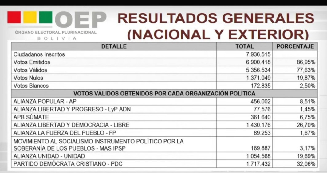 Con el 100% de las actas computadas, los resultados finales oficiales presentados por el Órgano Electoral Plurinacional (OEP) confirman la victoria del PDC con un total de 1.717.432 votos válidos, lo que representa el 32,06% del total nacional.