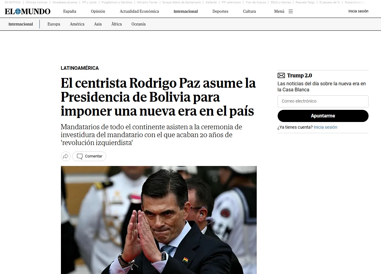 La Paz, 08 de noviembre de 2025 (ABI). – La prensa internacional siguió minuto a minuto la investidura del presidente Rodrigo Paz, celebrada este sábado en la Asamblea Legislativa en la ciudad de La Paz.