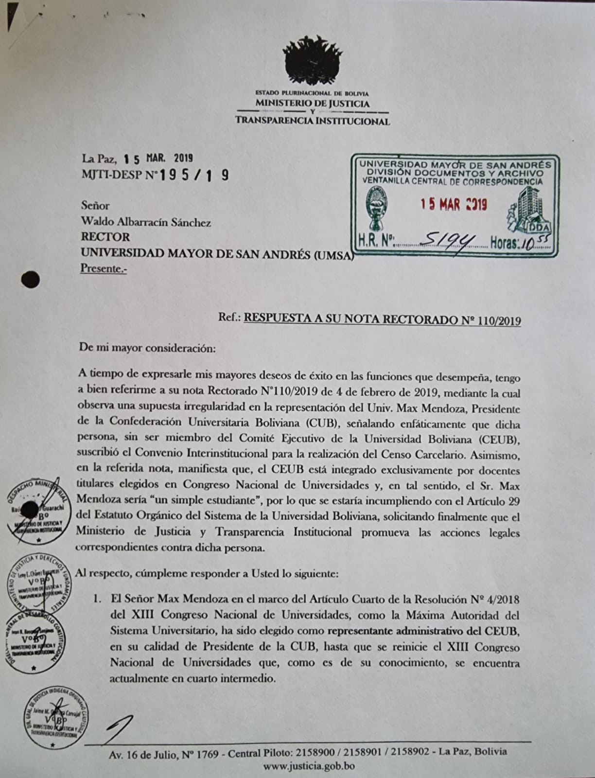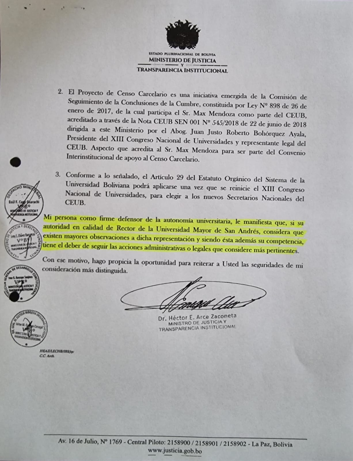 Ante esta nota, en fecha 15 de marzo de 2019, Héctor Arce, en su condición de Ministro de Justicia, a través de otro documento responde: “Mi persona, como firme defensor de la autonomía universitaria, le manifiesta que, si su autoridad en calidad de Rector de la Universidad Mayor de San Andrés, considera que existen mayores observaciones a dicha representación y siendo ésta además su competencia, tiene el deber de seguir las acciones administrativas o legales que considere más pertinentes (sic)”.